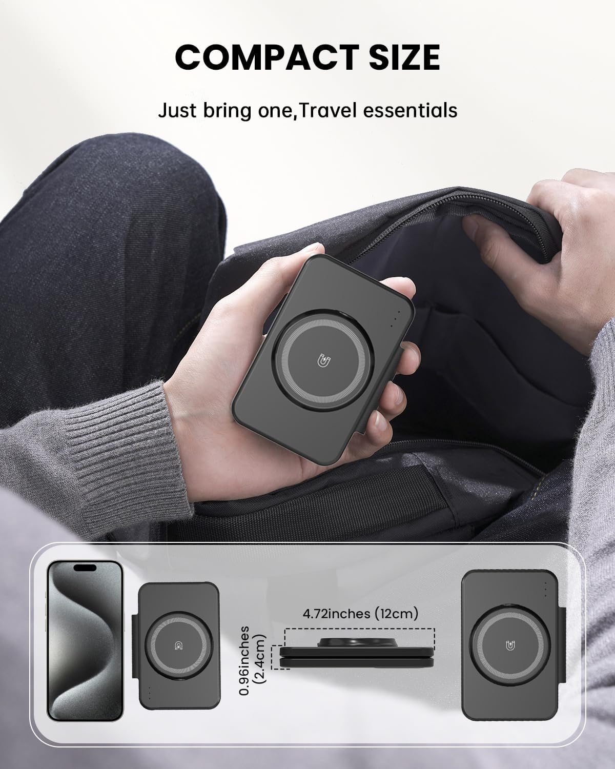 Kompaktna in zložljiva polnilna postaja z magnetnim poravnavanjem omogoča hitro in varno brezžično polnjenje treh Apple naprav hkrati – iPhone, Apple Watch in AirPods – z le enim kablom in enim napajalnikom.