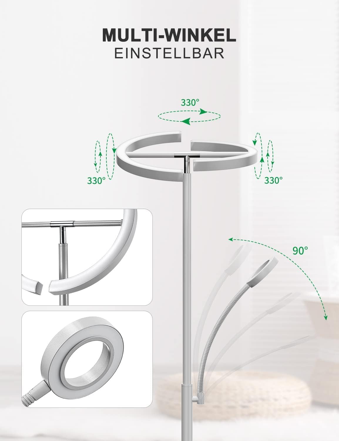 Ta sodobna talna LED svetilka ponuja zmogljivo glavno osvetlitev in udobno usmerjeno bralno svetlobo, ki jo prilagodite svojim potrebam – od tople bele za sproščene večere do hladne bele za fokusirano delo.