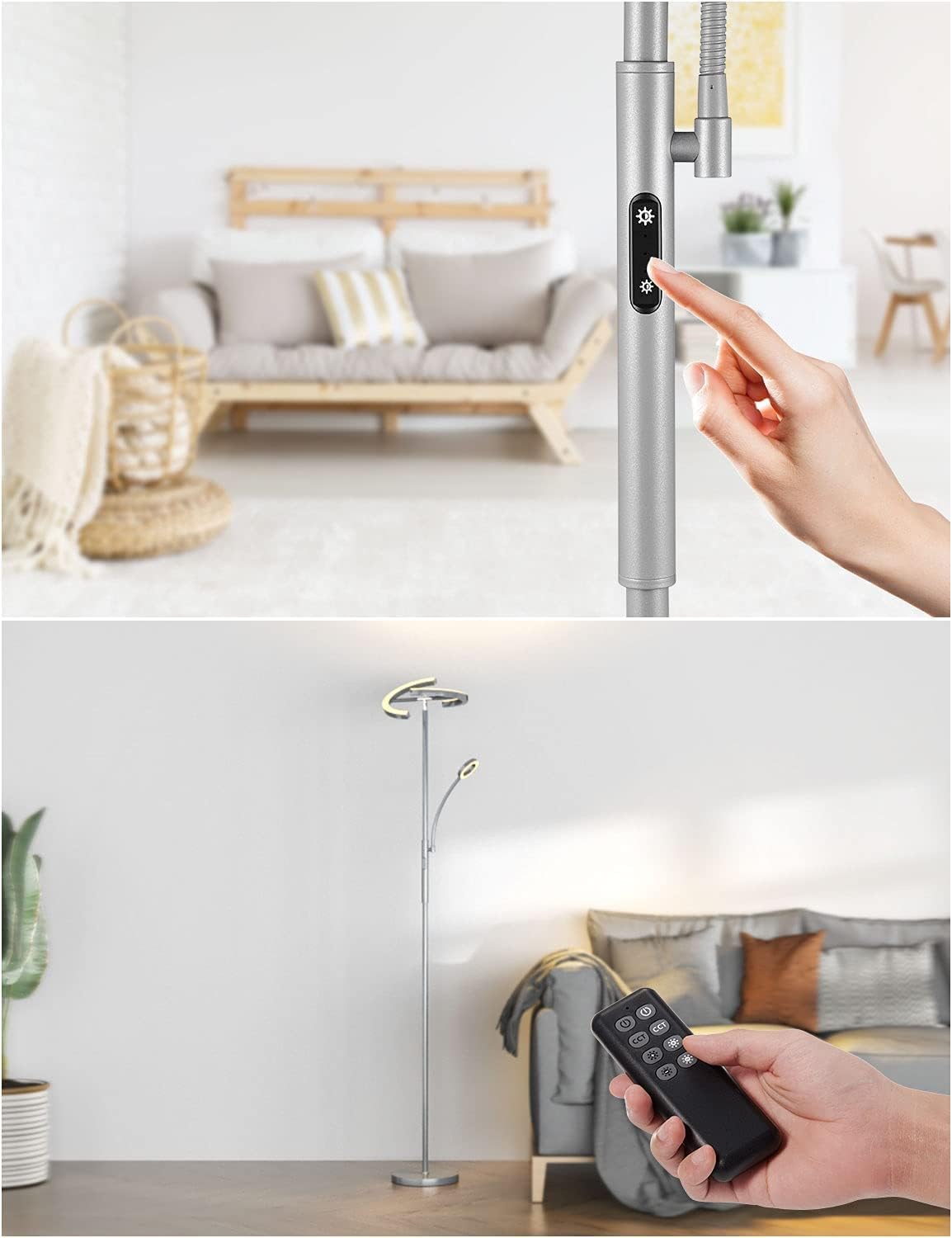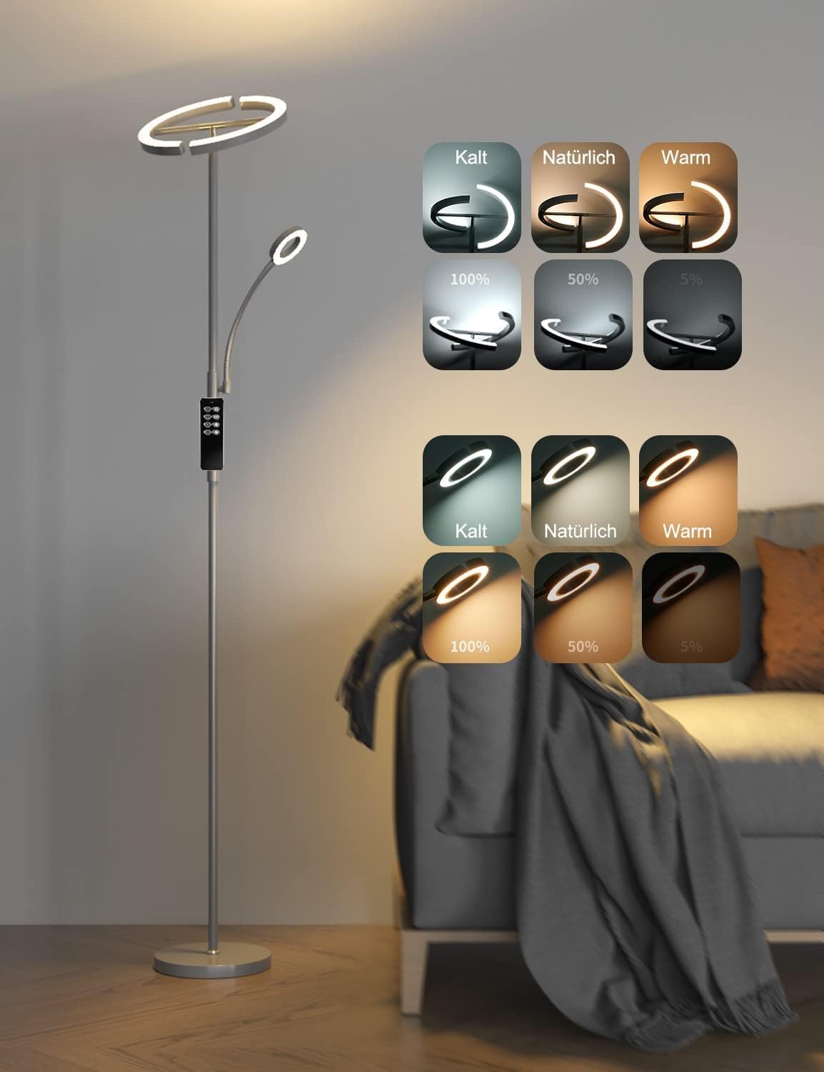 Elegantna in praktična talna svetilka z ločeno bralno lučjo, nastavljivo barvno temperaturo in svetlostjo, ki jo lahko upravljate z dotikom ali priloženim daljinskim upravljalnikom.