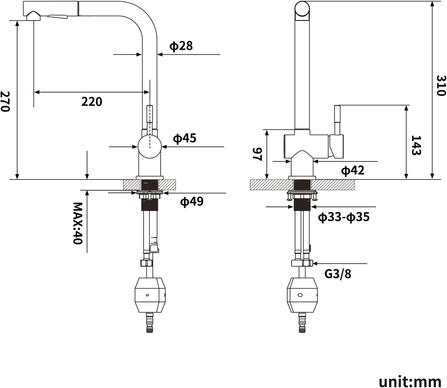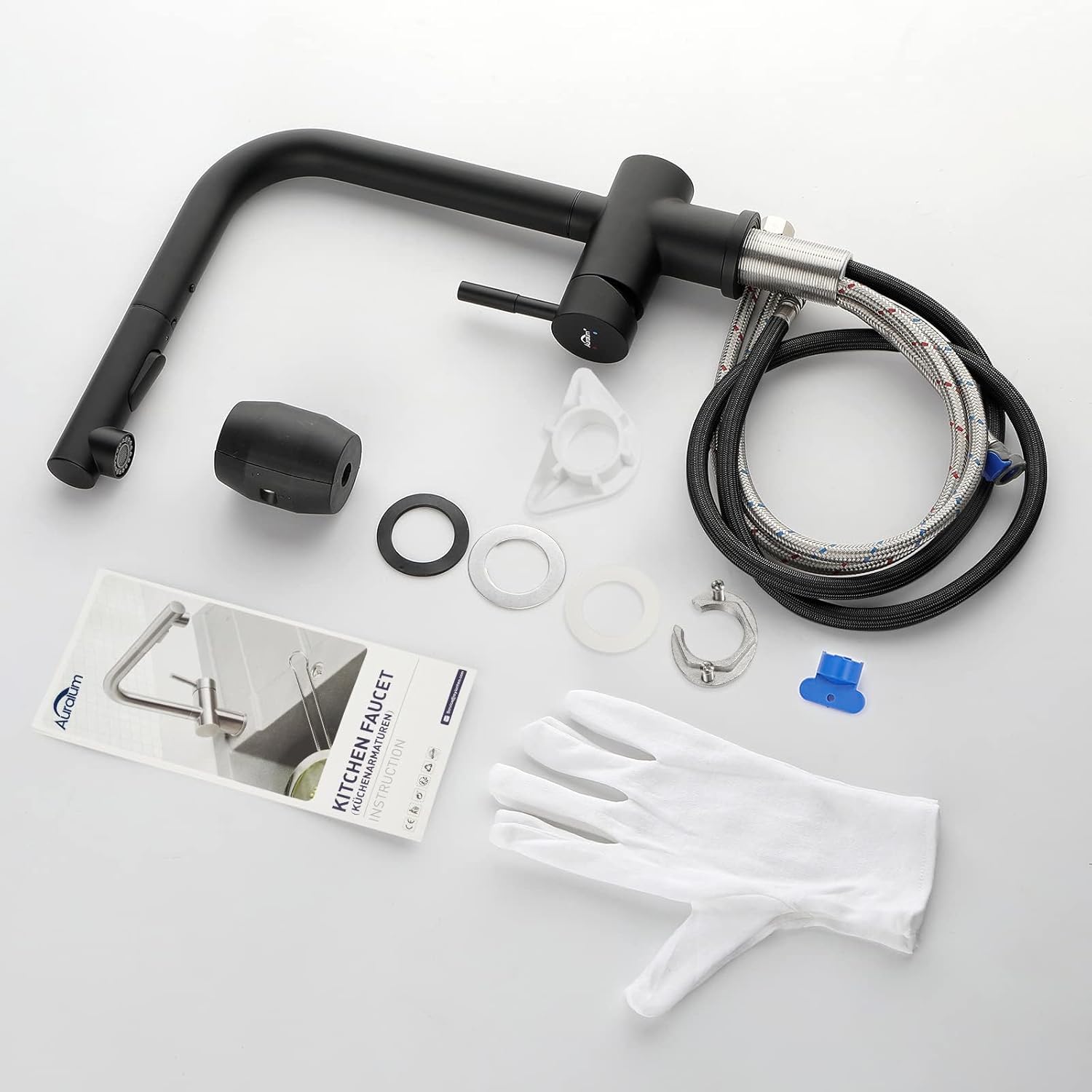 Vključeno v komplet: Kuhinjska armatura, 2 cevki za toplo in hladno vodo (60 cm), univerzalni priključek G3/8
