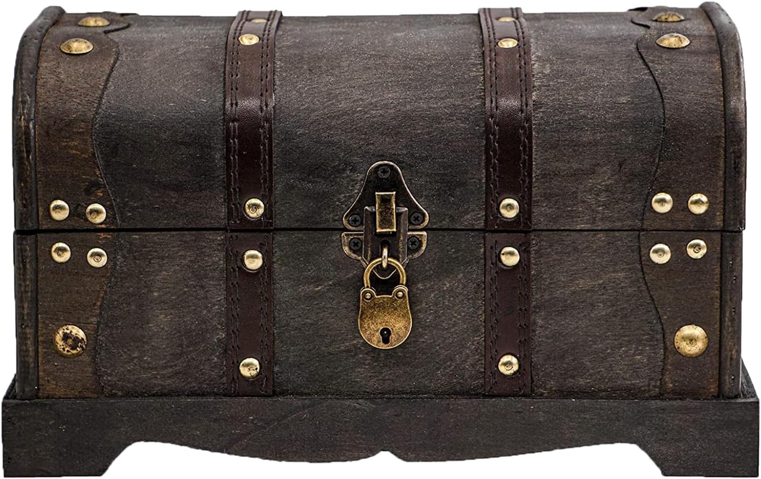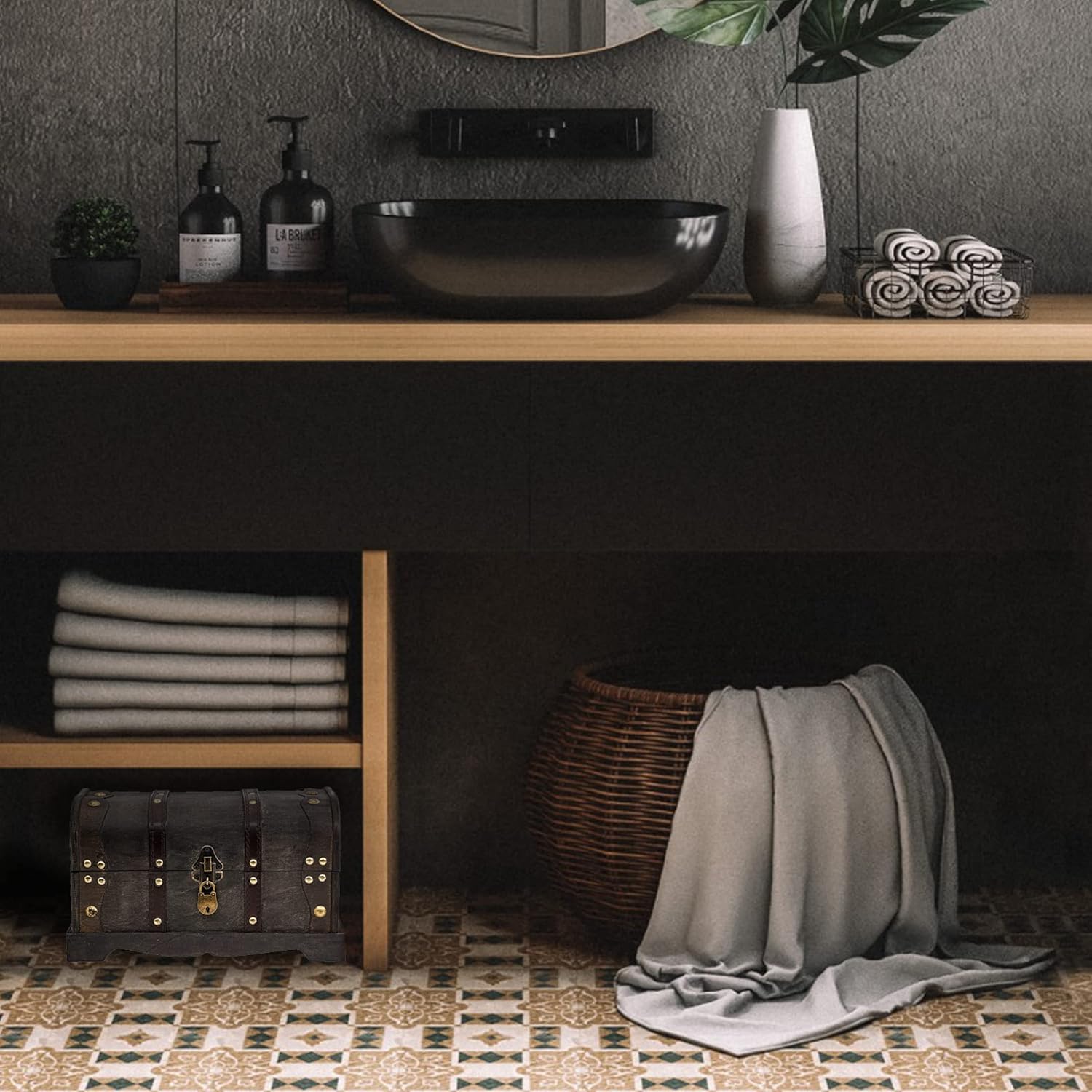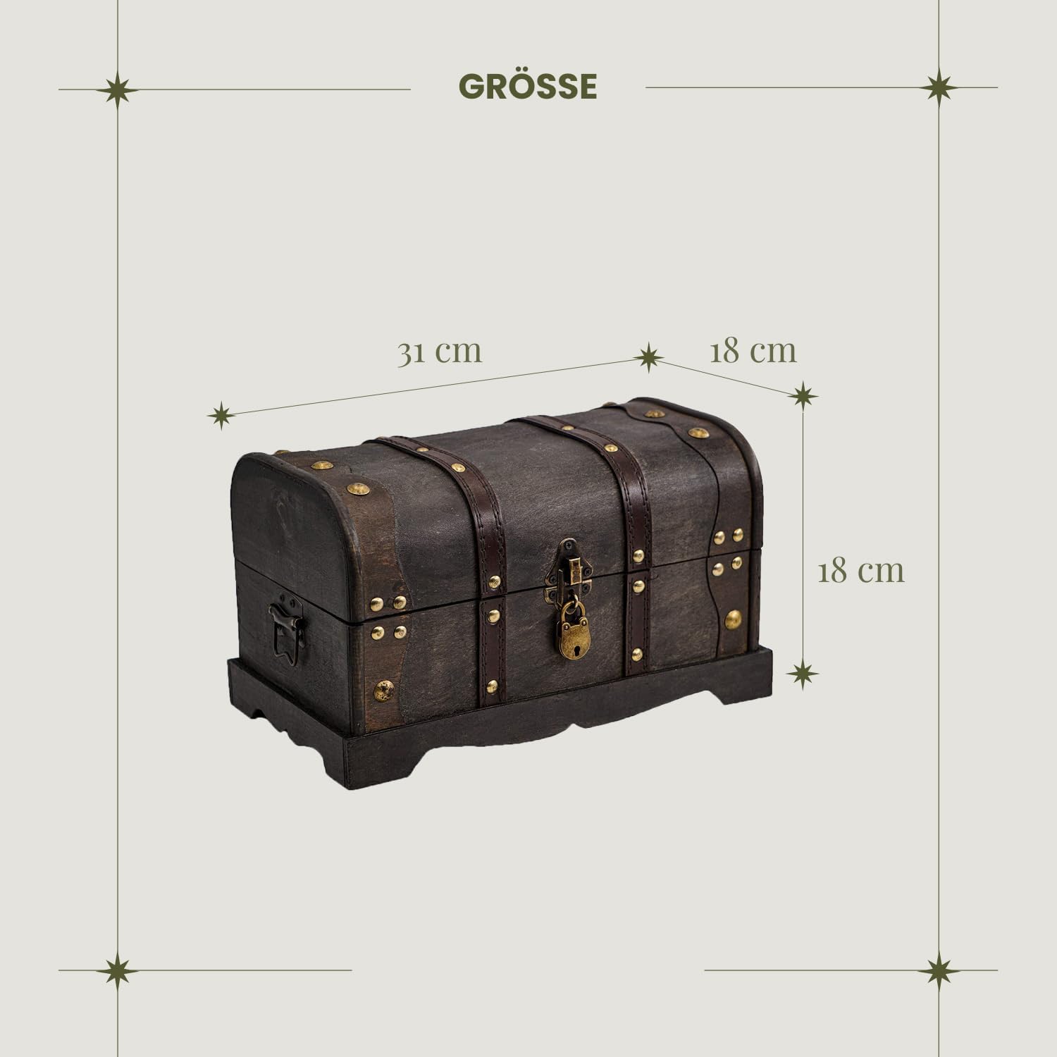 Ta zakladna skrinja združuje estetsko vrednost in uporabnost, zato je idealna tako kot dekorativni kos pohištva kot tudi za varno shranjevanje osebnih predmetov.