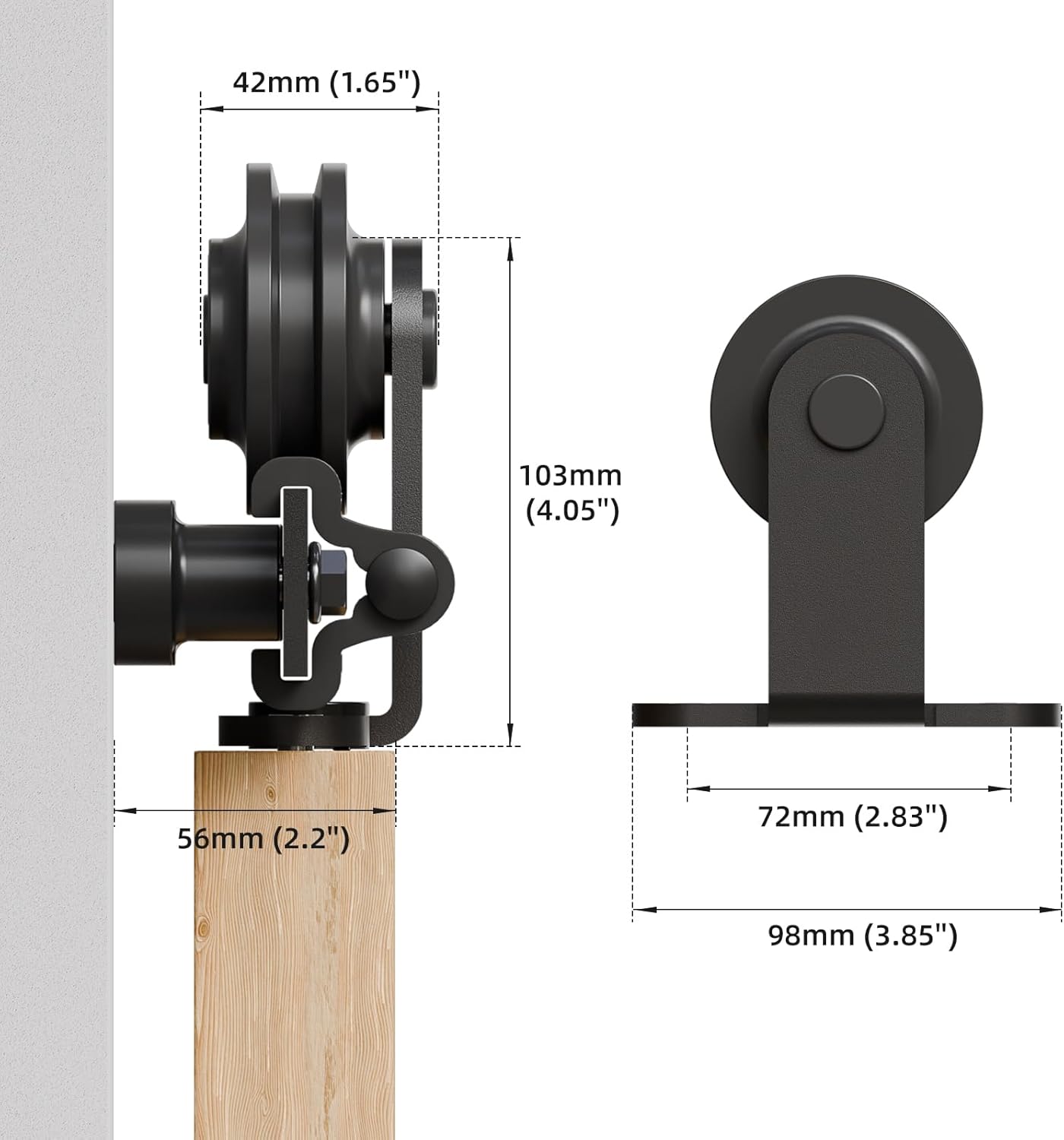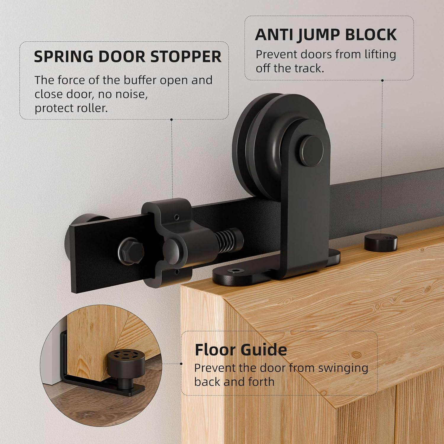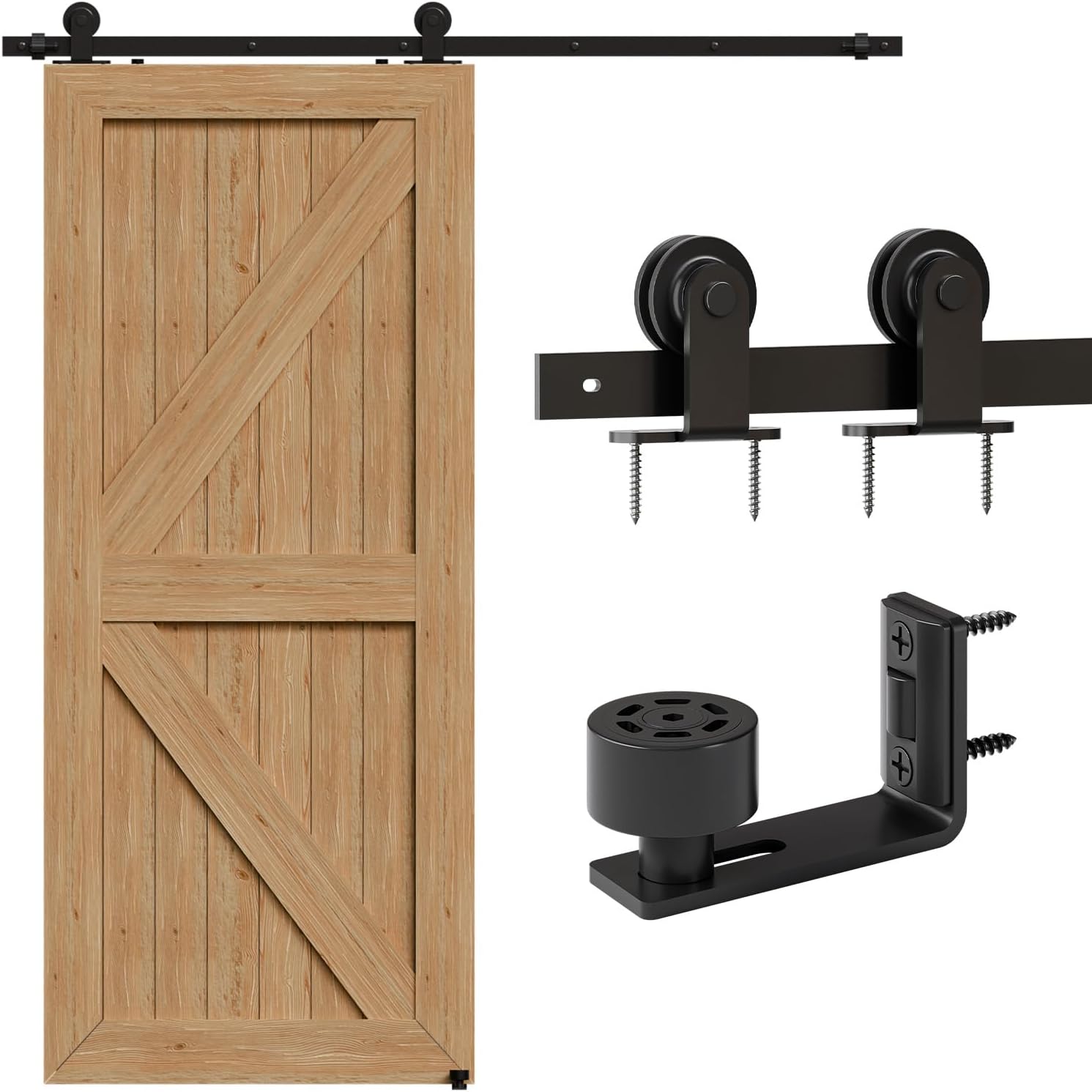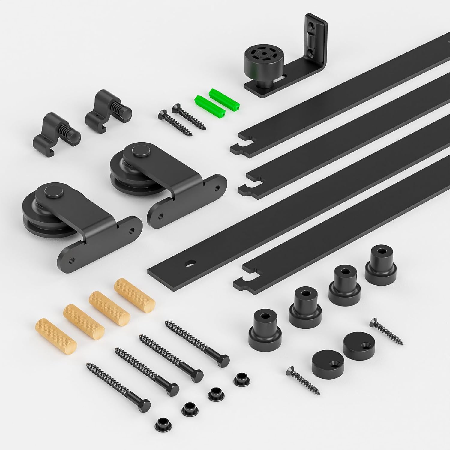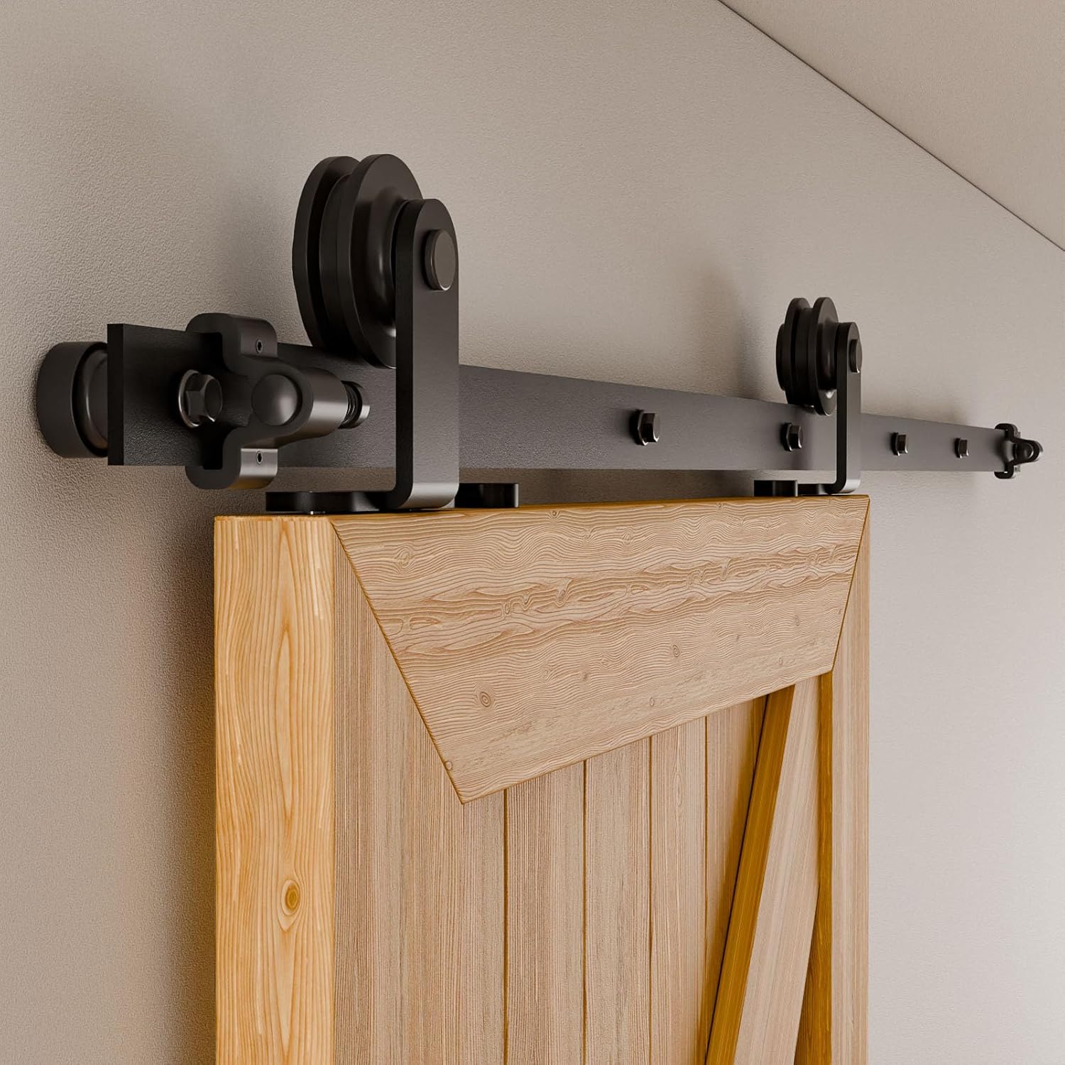 Komplet visokokakovostne strojne opreme za drsna vrata s trakom iz aluminija, kolesi in tlačnim vodilom, primeren za lesena vrata do širine 100 cm.