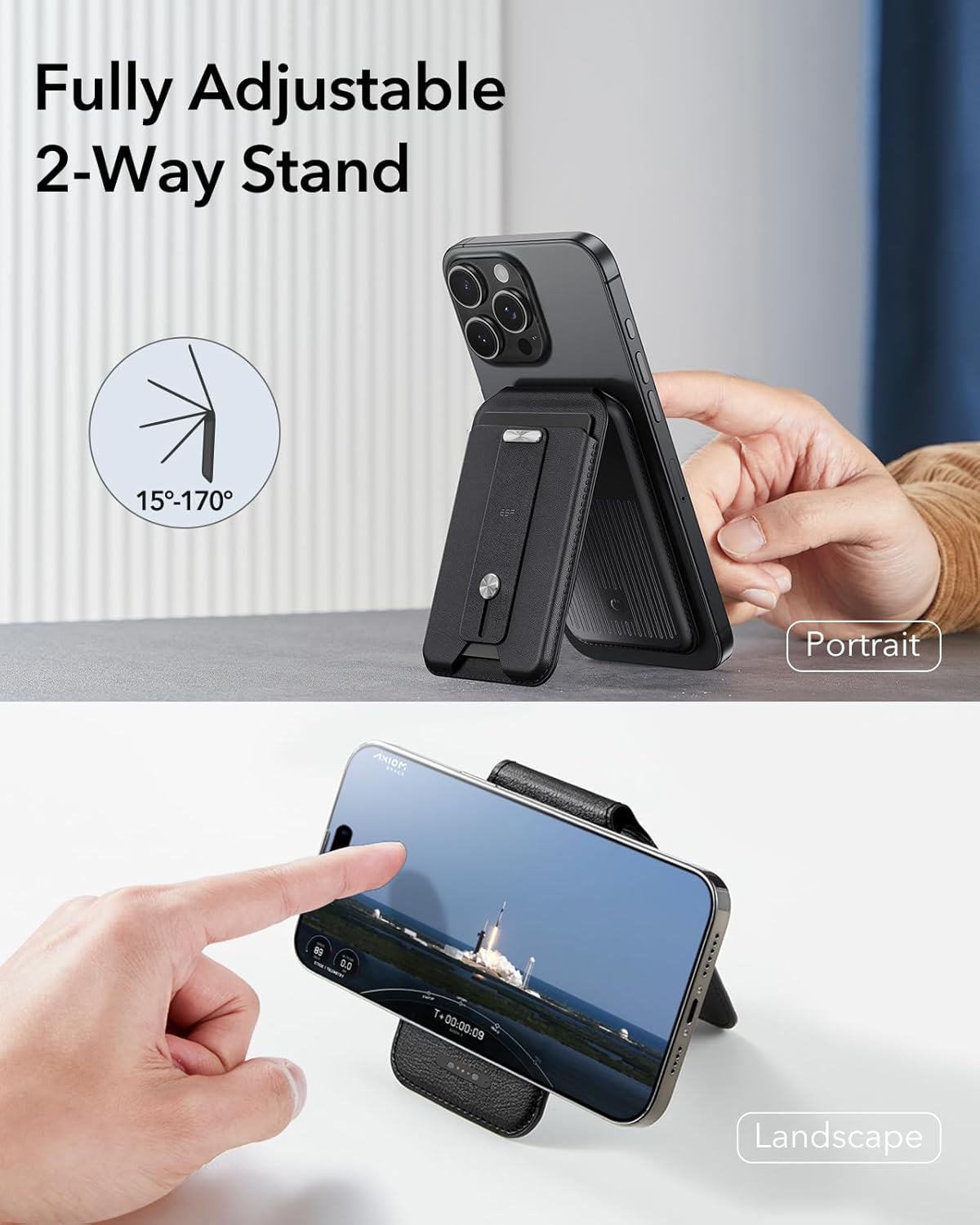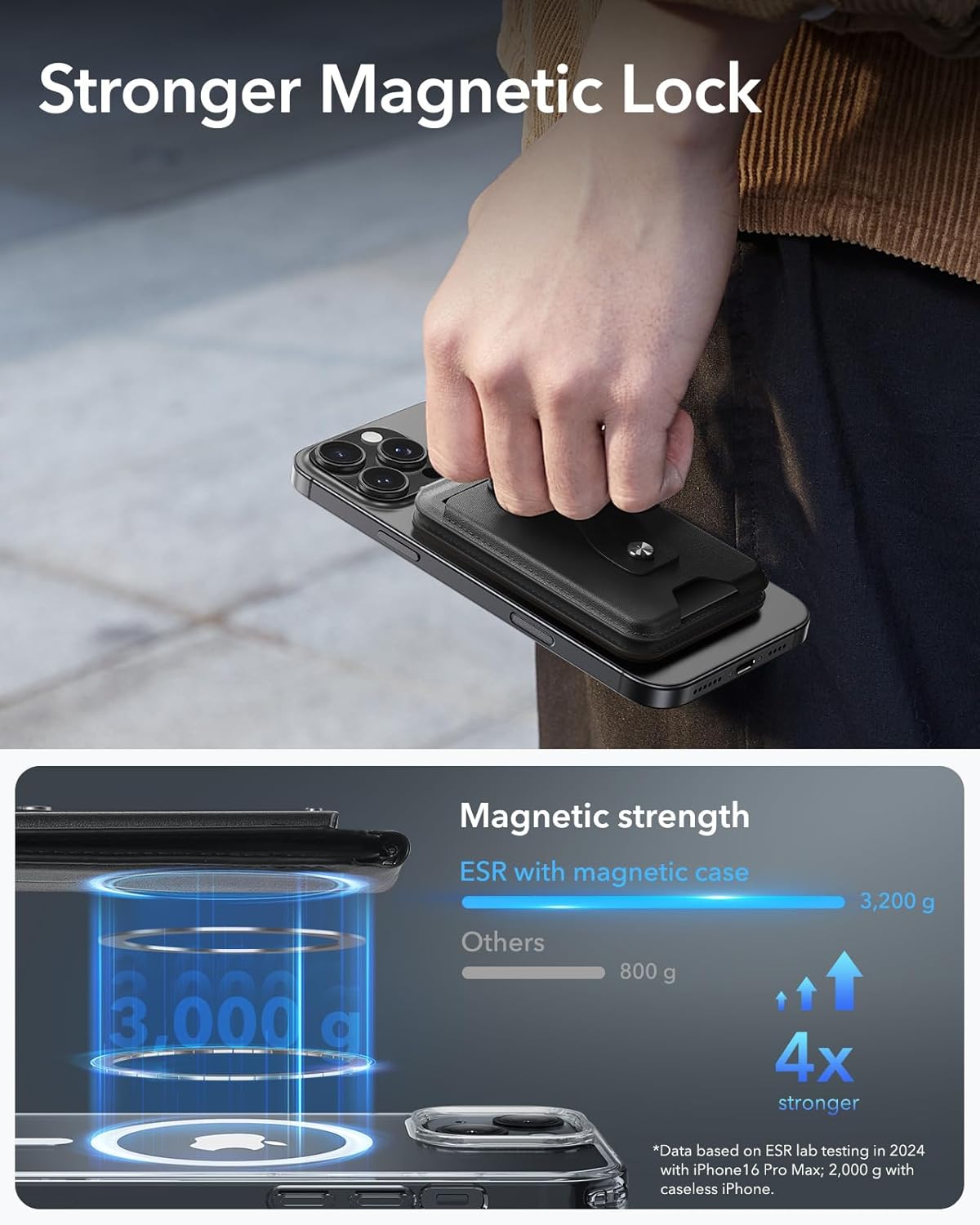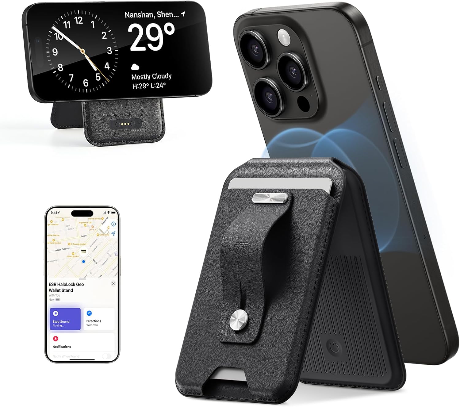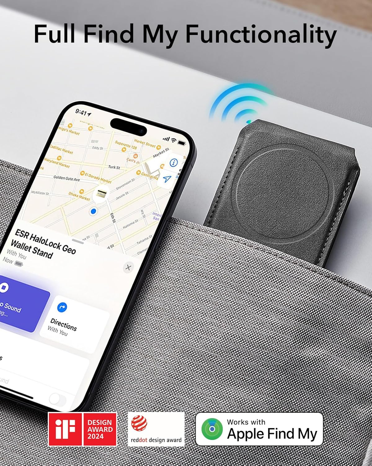 Denarnica za iPhone z integriranim sledilnikom Find My in izjemno močnimi magneti, ki varno držijo telefon in do 3 kartice. Ima funkcijo stojala in priročen nastavek za boljši oprijem.