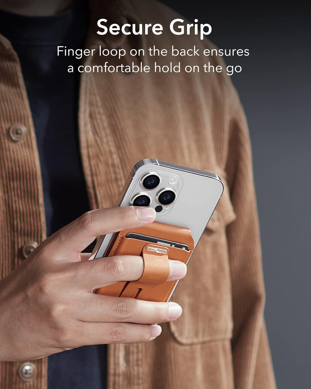 Denarnica za iPhone z integriranim sledilnikom Find My in izjemno močnimi magneti, ki varno držijo telefon in do 3 kartice. Ima funkcijo stojala in priročen nastavek za boljši oprijem.