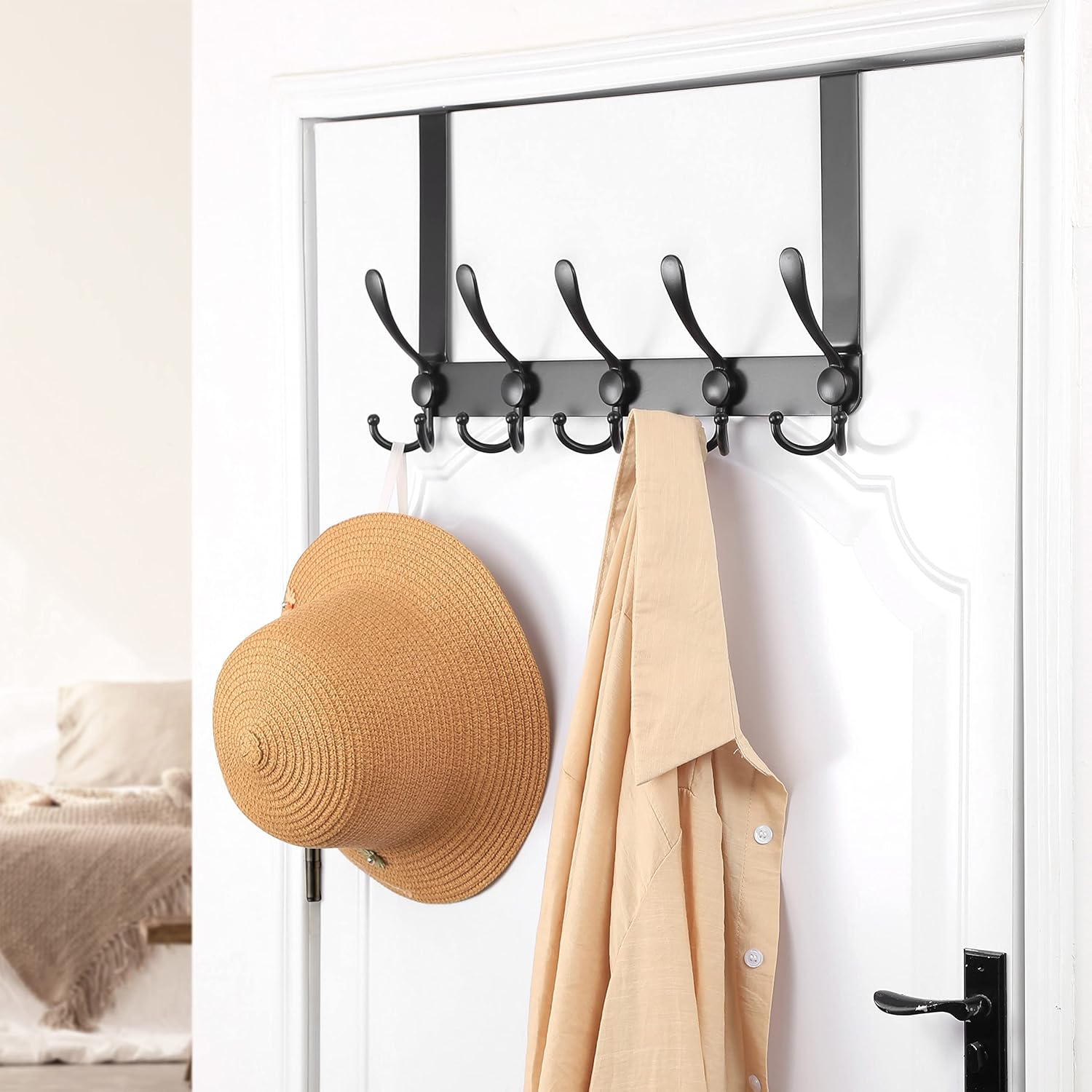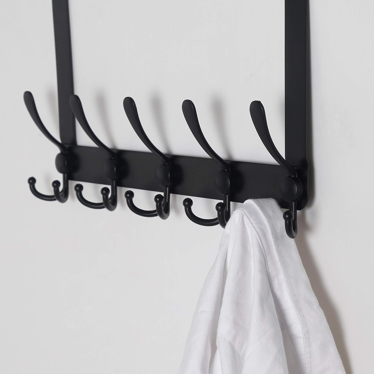 Praktičen in robusten obešalnik za vrata s 5 trojnimi kljukami omogoča varčno izrabo prostora za shranjevanje oblačil, brisač, torb, kap, halj in drugih dodatkov. Mat črna barva in minimalistična zasnova se popolnoma prilegata sodobnim prostorom, medtem ko zaščitne blazinice preprečujejo praske na vratih.