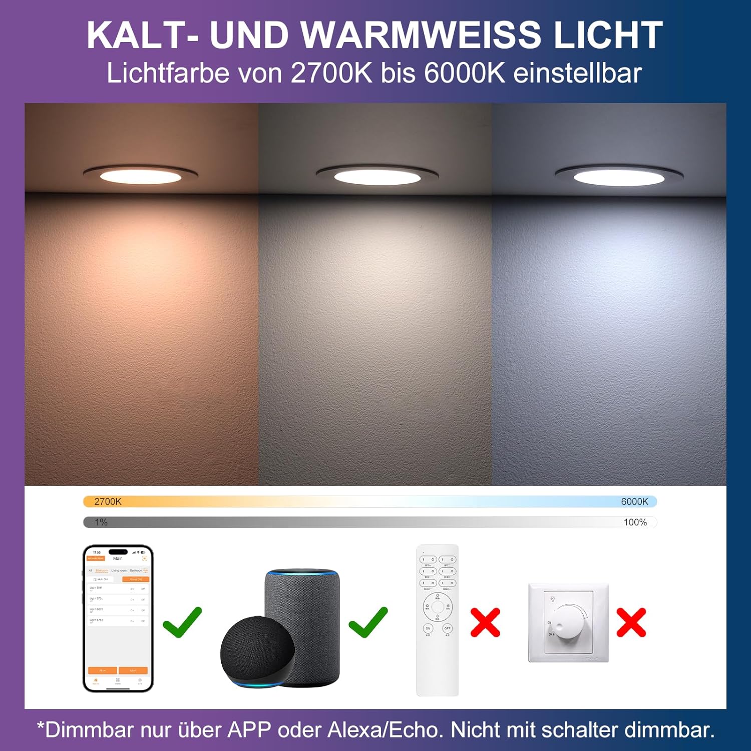 Pametne stropne LED vgradne luči DUSKTEC 10 W omogočajo popoln nadzor osvetlitve prek glasovnih ukazov Alexa ali prek aplikacije BRmesh na telefonu. Luči ponujajo 16 milijonov barv, nastavljivo temperaturo bele svetlobe od tople (2700 K) do hladne (6000 K) in zatemnitev od 1 % do 100 %, kar omogoča ustvarjanje popolnega ambienta doma ali delovnega prostora.