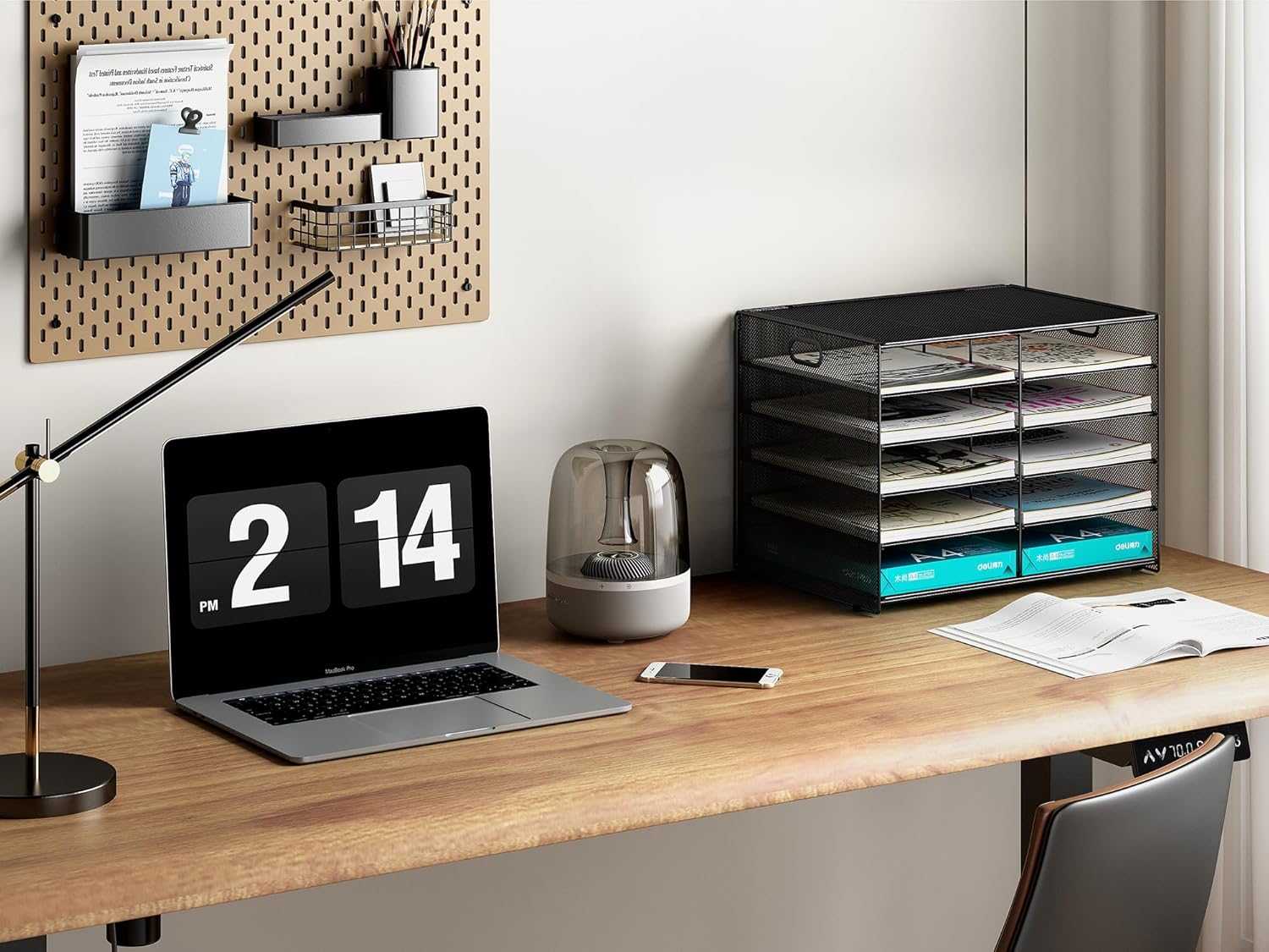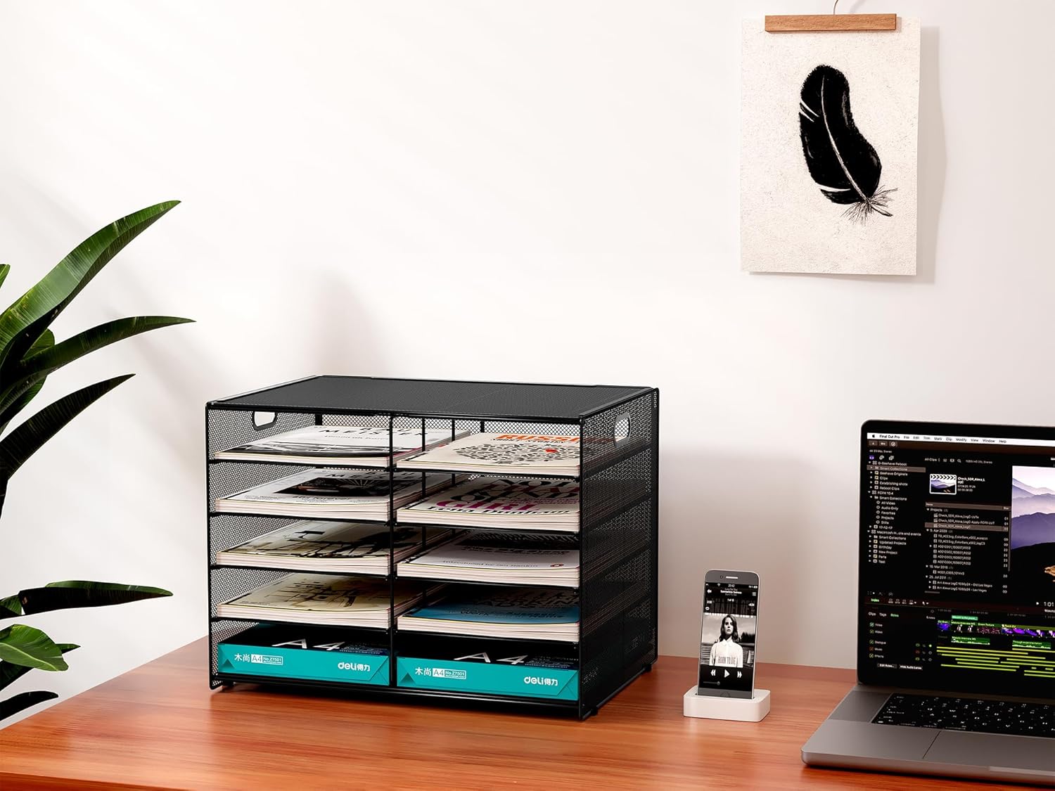 Kovinski organizator za pisarniško mizo je zasnovan za učinkovito shranjevanje in razvrščanje dokumentov formata A4. Sestavljen je iz desetih ločenih predalov in robustnega ogrodja, ki zagotavlja stabilnost in dolgotrajno uporabo v pisarniškem ali domačem okolju.