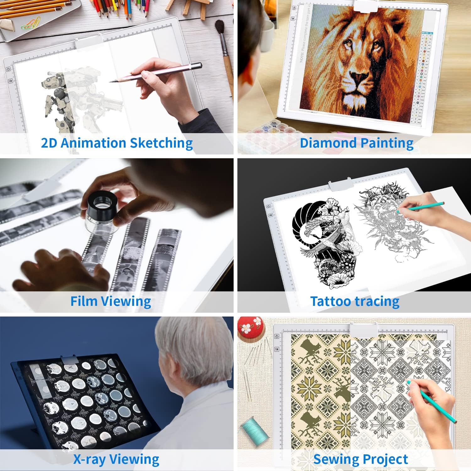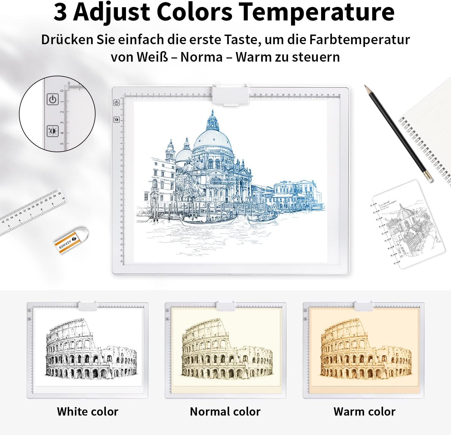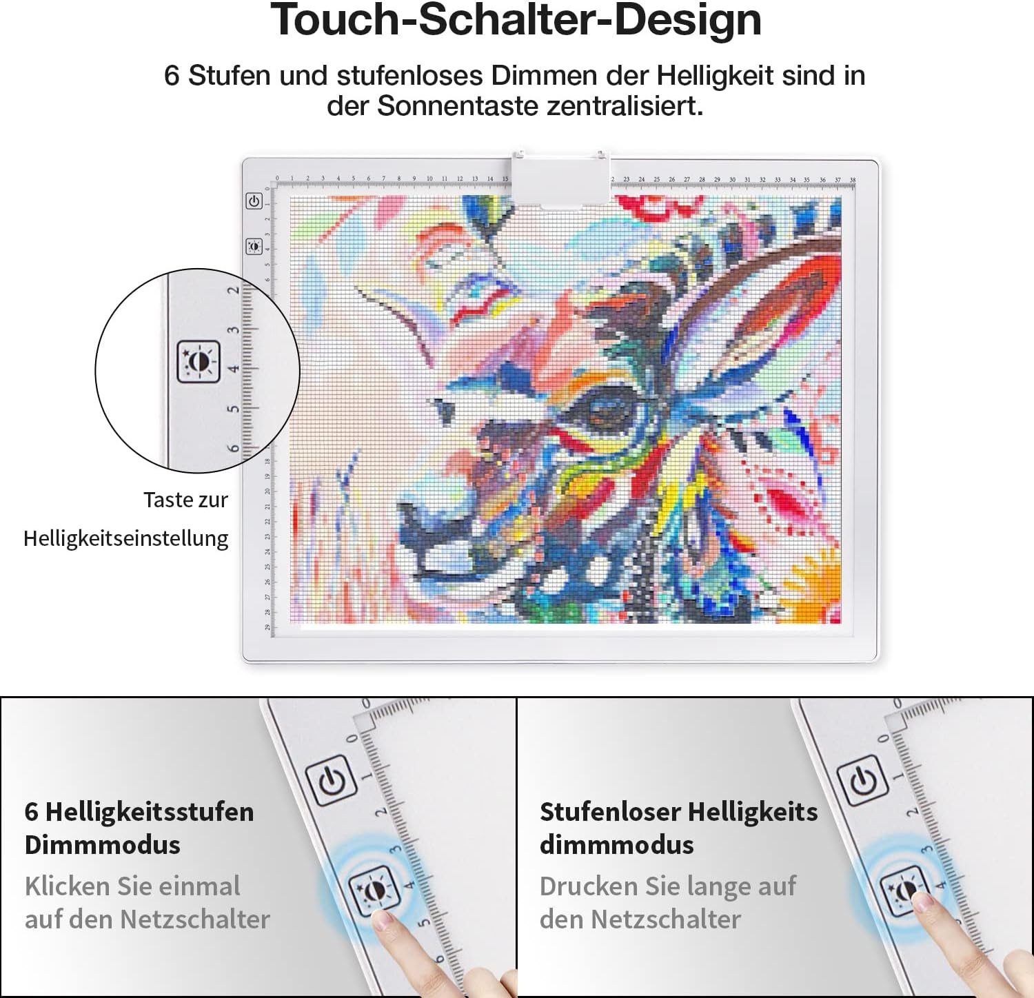 Večnamenska svetlobna tabla A3 z vgrajeno polnilno baterijo in Type-C priključkom je zasnovana za risanje, skiciranje, prerisovanje in ustvarjanje z diamantnimi slikami. Odlikujejo jo 3 barvni toni svetlobe, neomejena zatemnitev in vgrajeno stojalo za udobno uporabo v različnih pogojih osvetlitve.