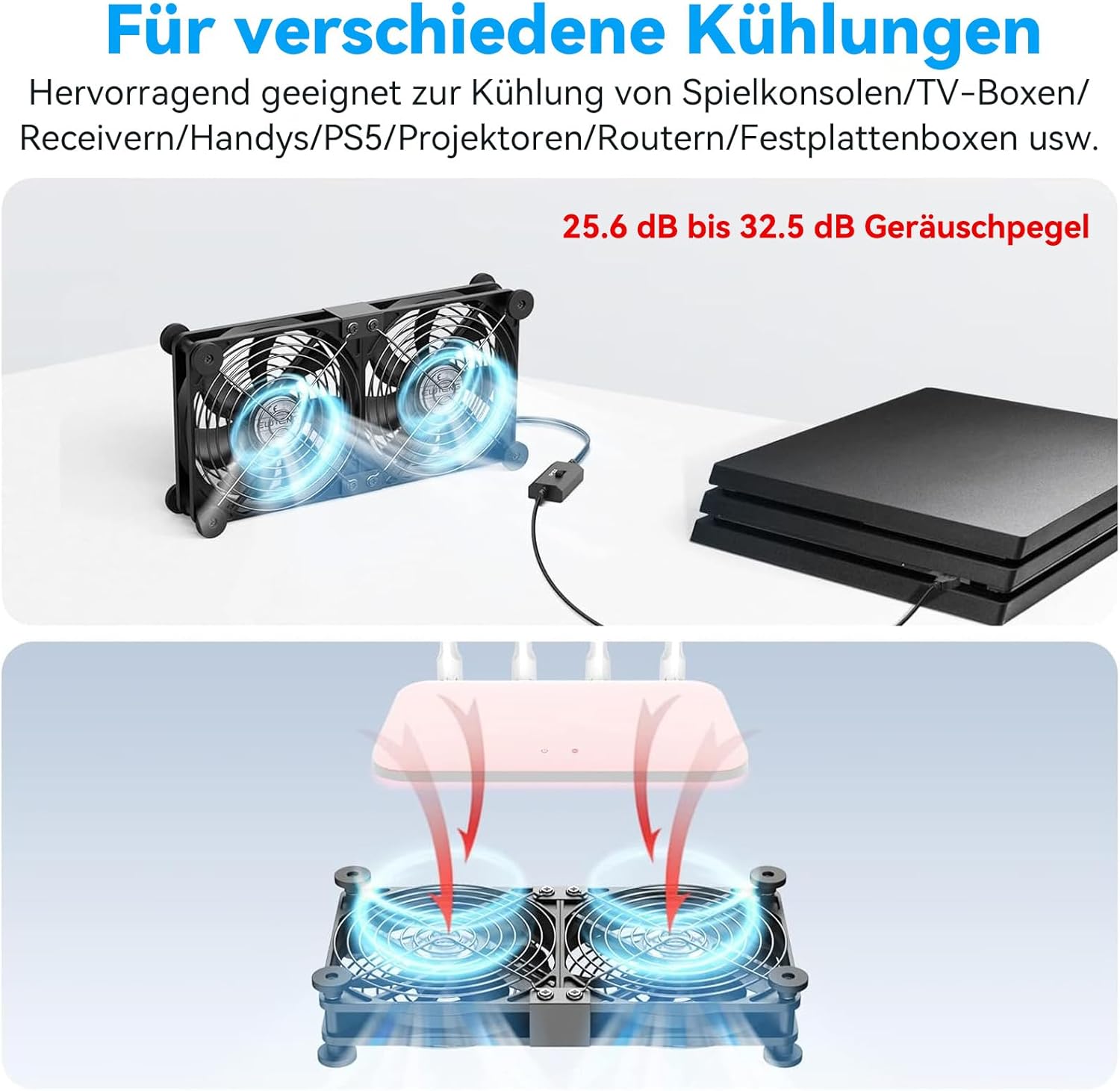 ELUTENG 2-v-1 USB ventilator z dvema enotama zagotavlja učinkovito hlajenje za širok nabor naprav – od računalnikov, prenosnikov in igralnih konzol do usmerjevalnikov, projektorjev in zunanjih diskov. Zasnova omogoča horizontalno ali vertikalno postavitev, 3 nastavljive hitrosti pa omogočajo popolno prilagoditev glede na potrebe. Trpežna konstrukcija z zaščitnimi mrežicami in gumijastimi nogicami skrbi za varno in tiho delovanje.