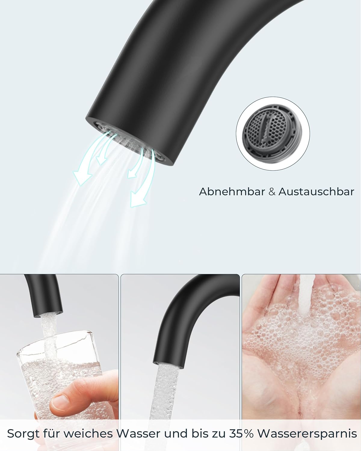 Varčna in tiha uporaba: Vgrajen aerator zmanjšuje porabo vode do 30 %, omejuje hrup in brizganje.