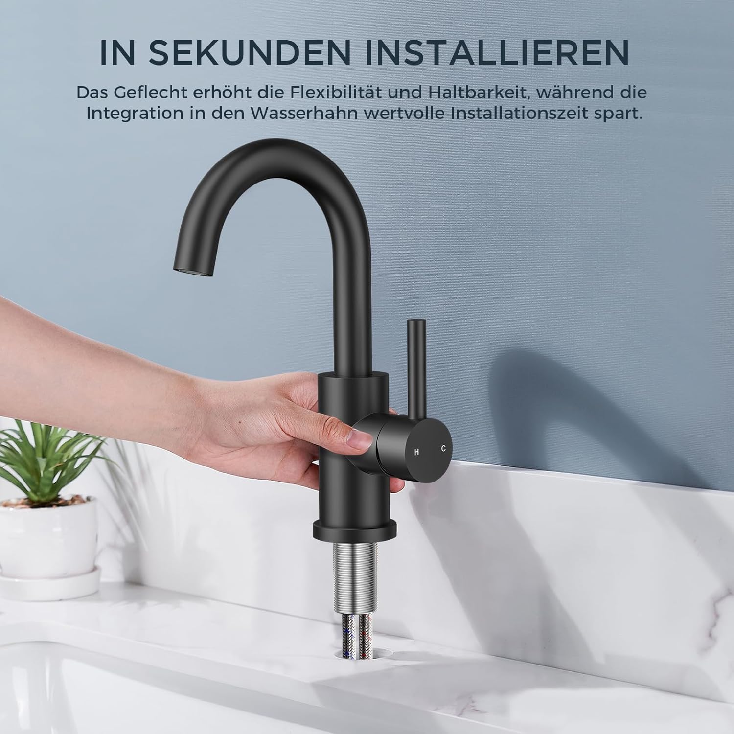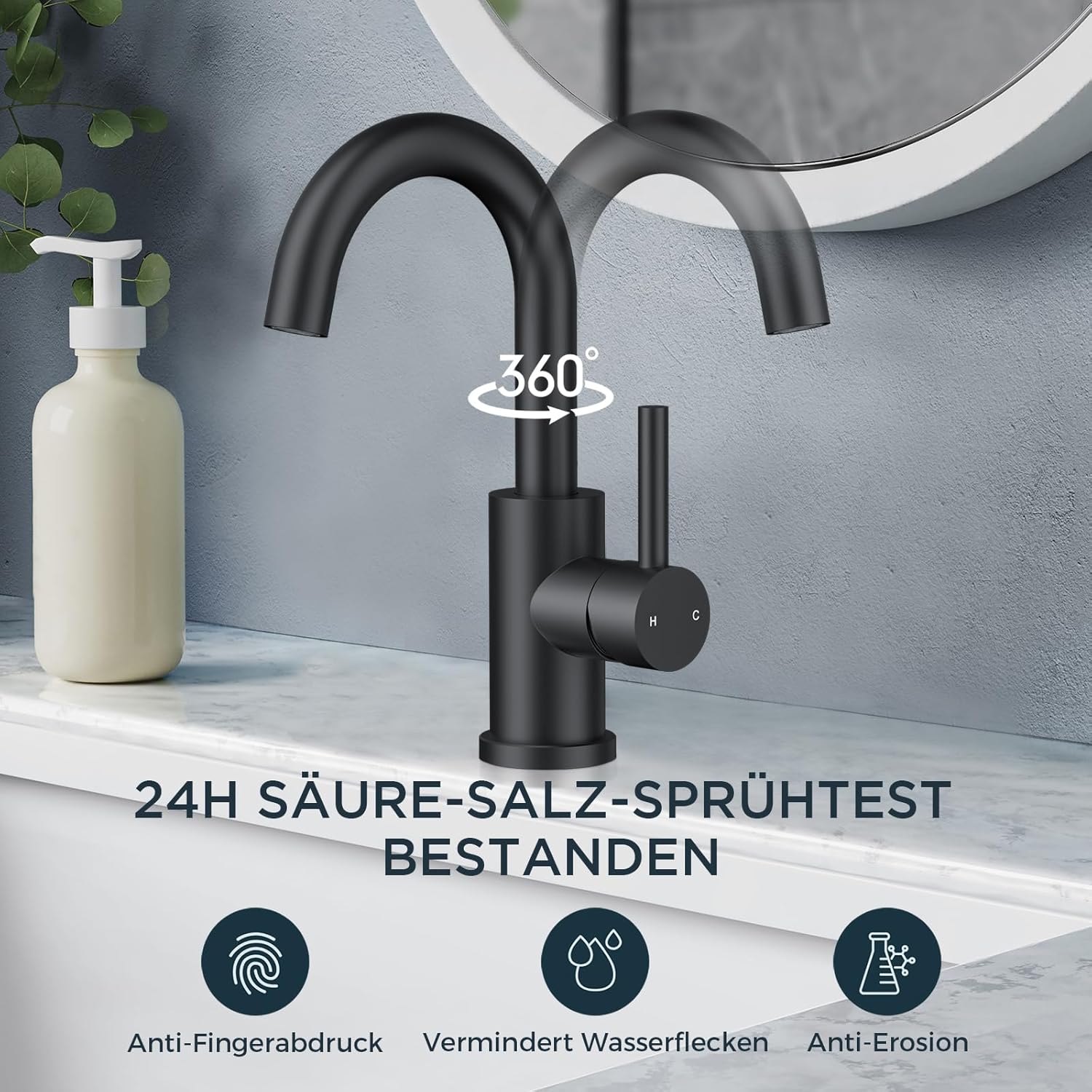 Elegantna kopalniška armatura v mat črni barvi prinaša sodoben videz in praktično funkcionalnost. Površina s petplastno nanotehnološko obdelavo je odporna proti rji, madežem in prstnim odtisom, kar zagotavlja dolgotrajen estetski videz. Z 360° vrtljivim izlivom ponuja več svobode pri uporabi, enoročna ročica pa omogoča preprosto nastavitev temperature in pretoka vode.