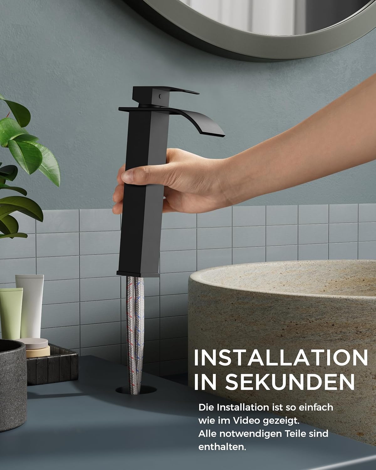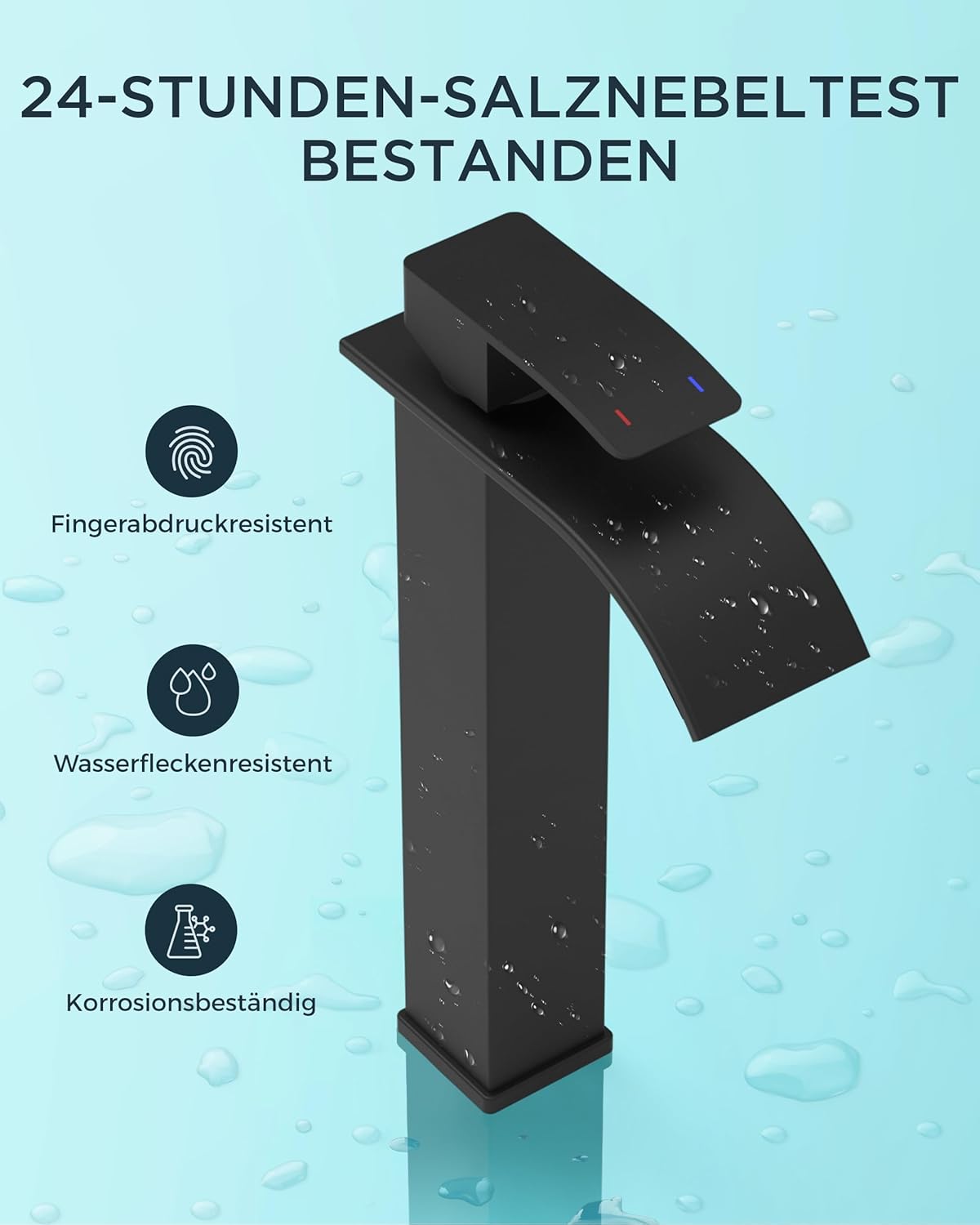 Elegantna armatura z visokim vodopadnim izlivom združuje sodoben dizajn in praktičnost. Posebna konstrukcija izliva zagotavlja mehkejši in tišji pretok vode z manj škropljenja, hkrati pa omogoča varčno porabo vode in energije. Mat črna površina je odporna proti praskam, koroziji in bledenju, kar zagotavlja dolgotrajno estetsko vrednost v vsaki kopalnici.