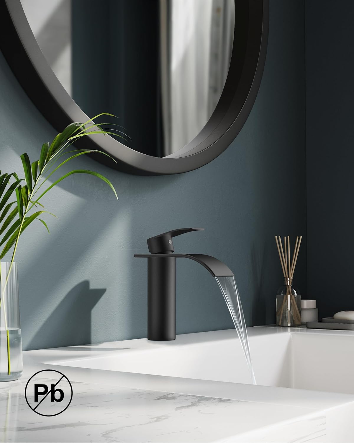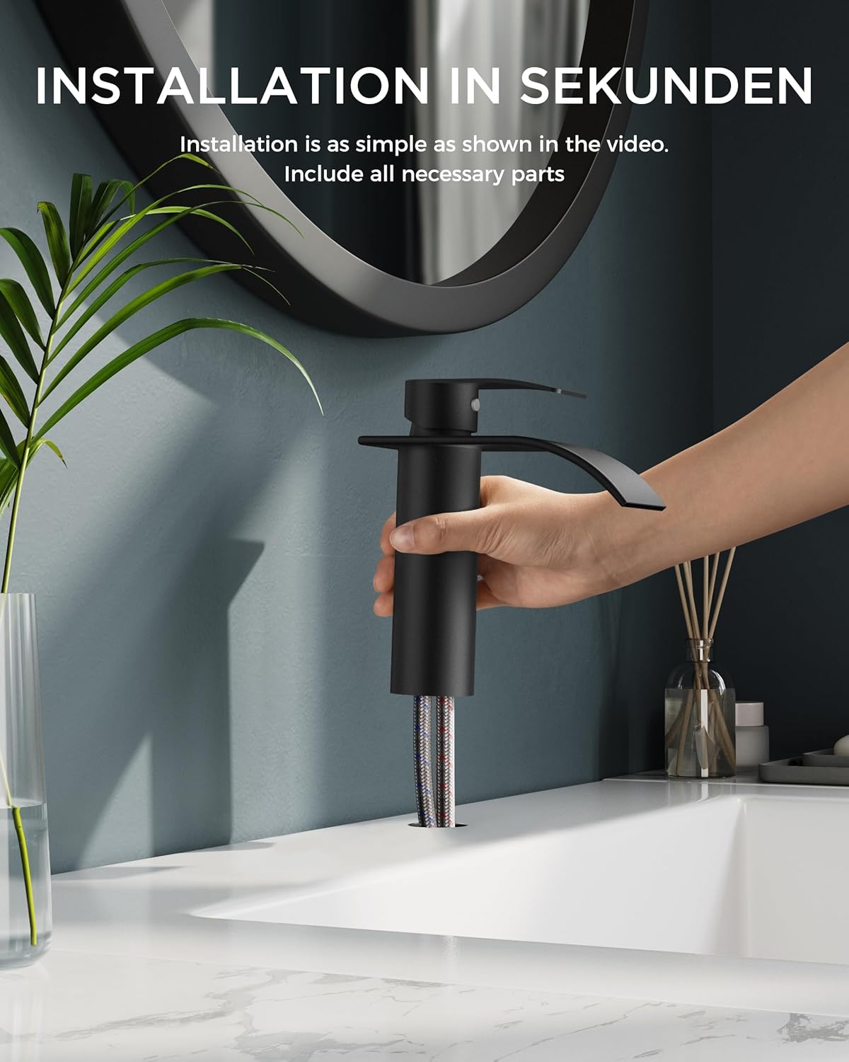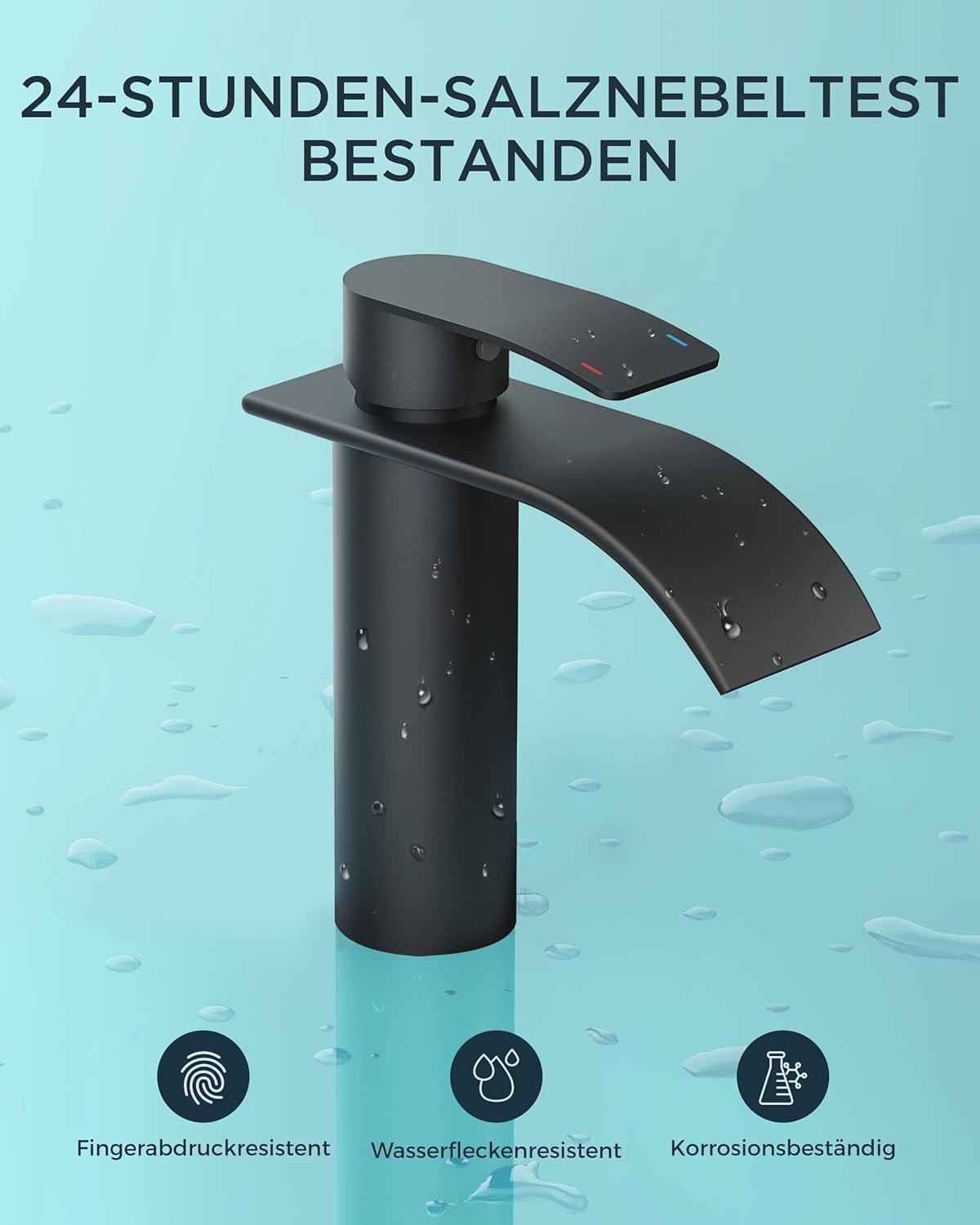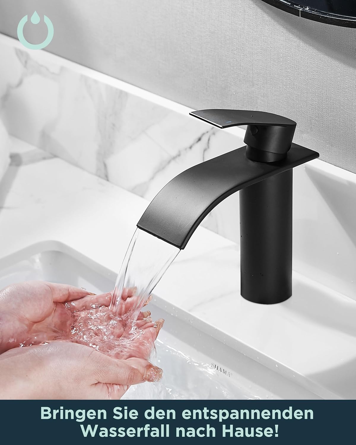 Elegantna kopalniška armatura z vodopadnim izlivom združuje sodoben dizajn in funkcionalnost. Njena mat črna površina je odporna na prstne odtise in rjo, zato ohranja svež videz tudi v vlažnem kopalniškem okolju. Vodopadni izliv omogoča naraven in mehak pretok vode, keramična kartuša pa zagotavlja dolgotrajno delovanje brez puščanja.