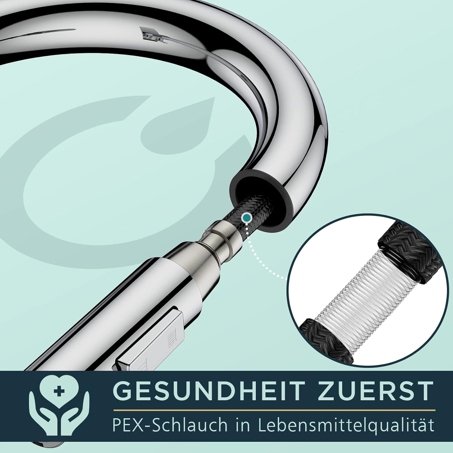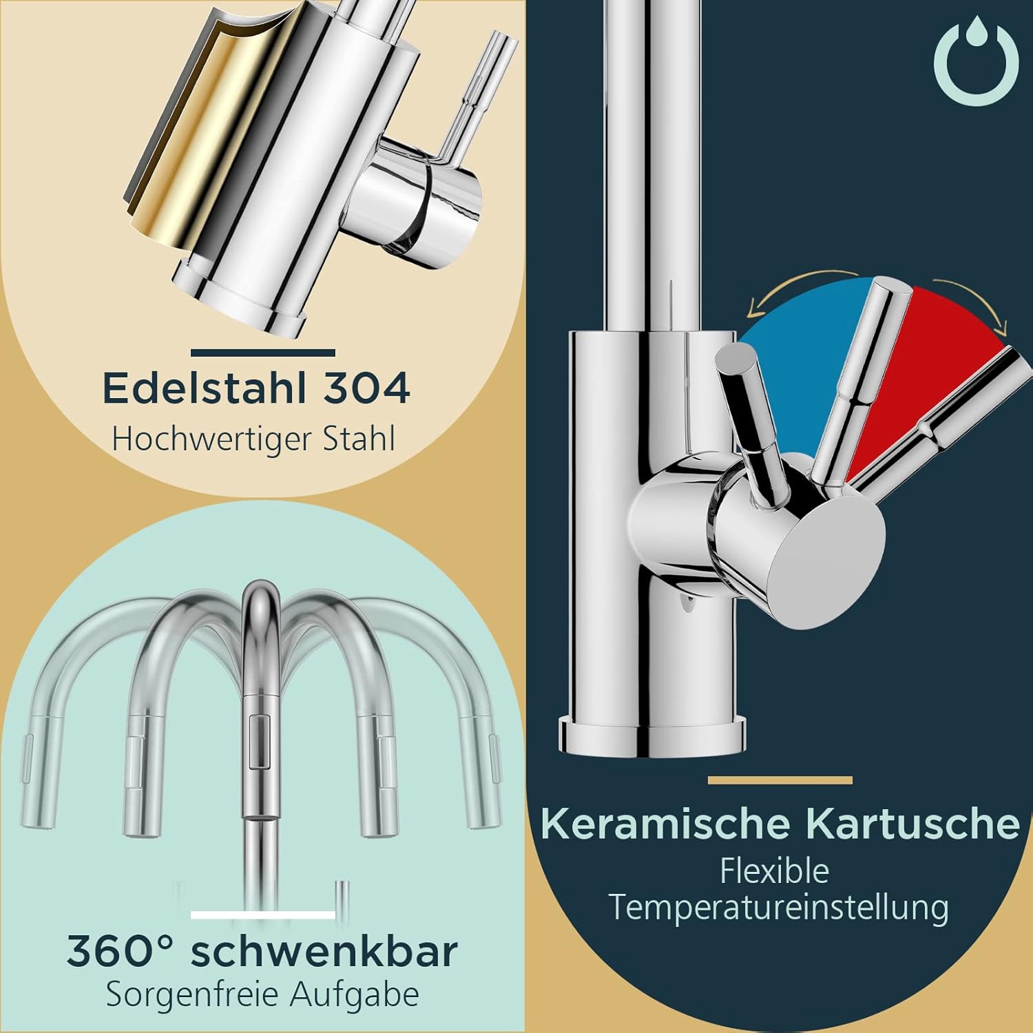Ta kuhinjska armatura združuje sodoben dizajn z visoko funkcionalnostjo. Izliv z 360° vrtljivostjo in izvlečno prho omogoča enostavno upravljanje ter dostop do vseh delov pomivalnega korita. Izdelana je iz težkega nerjavečega jekla brez svinca, s keramično kartušo, ki zagotavlja dolgo življenjsko dobo brez puščanja.