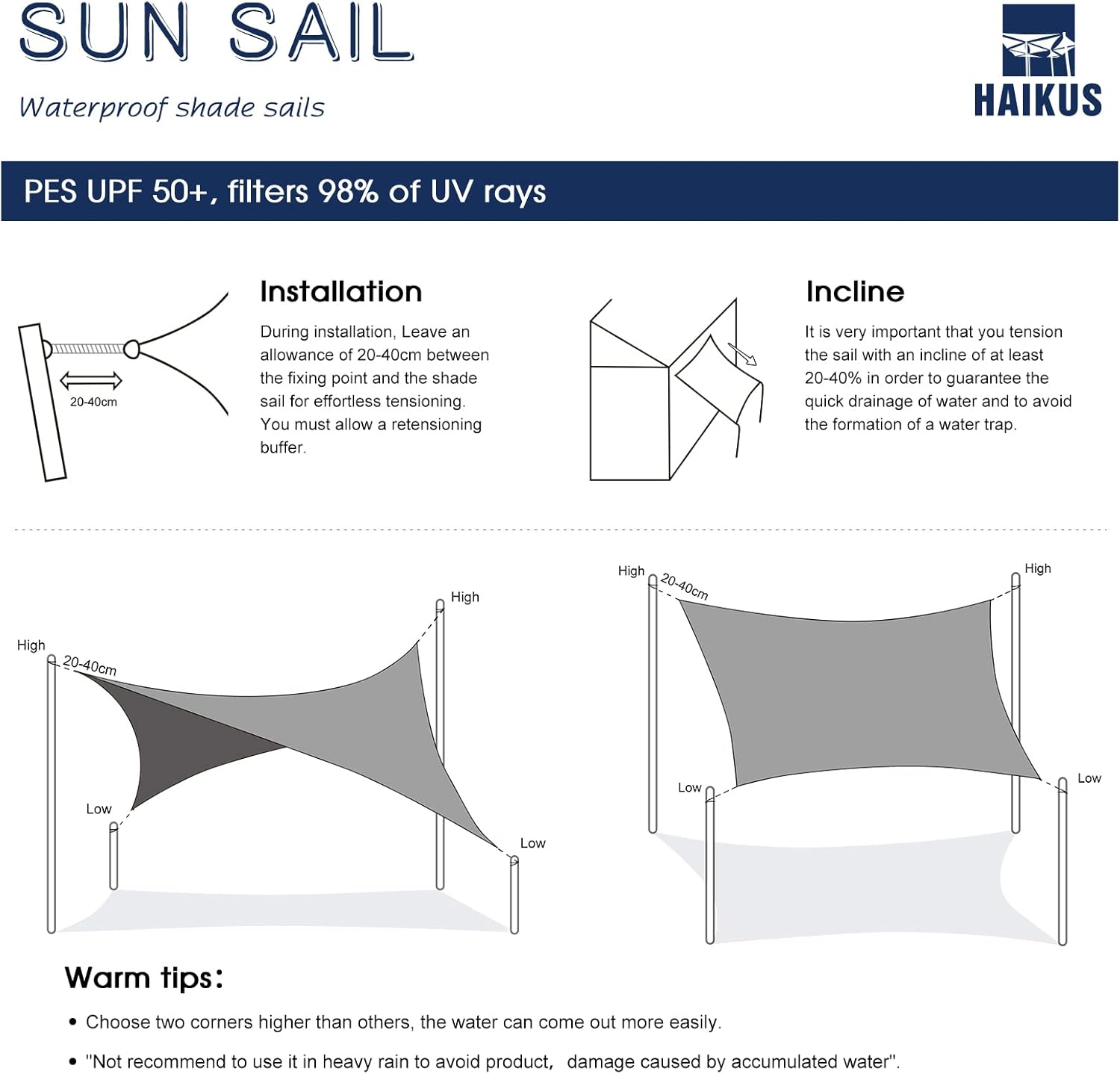 Senčno jadro HAIKUS je zasnovano za učinkovito zaščito pred soncem, UV-žarki in rahlim dežjem, hkrati pa ohranja eleganten videz in visoko funkcionalnost. Izdelano je iz kakovostne poliestrske tkanine z dvoslojno PU-prevleko, ki zagotavlja vodoodpornost in dolgo življenjsko dobo, idealno za vrtove, terase in balkone.