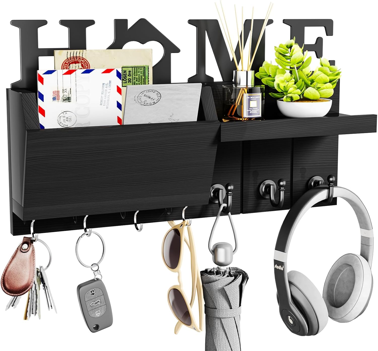 HAPIRM lesena stenska polica z 7 kavlji in dekorativnim napisom "HOME"