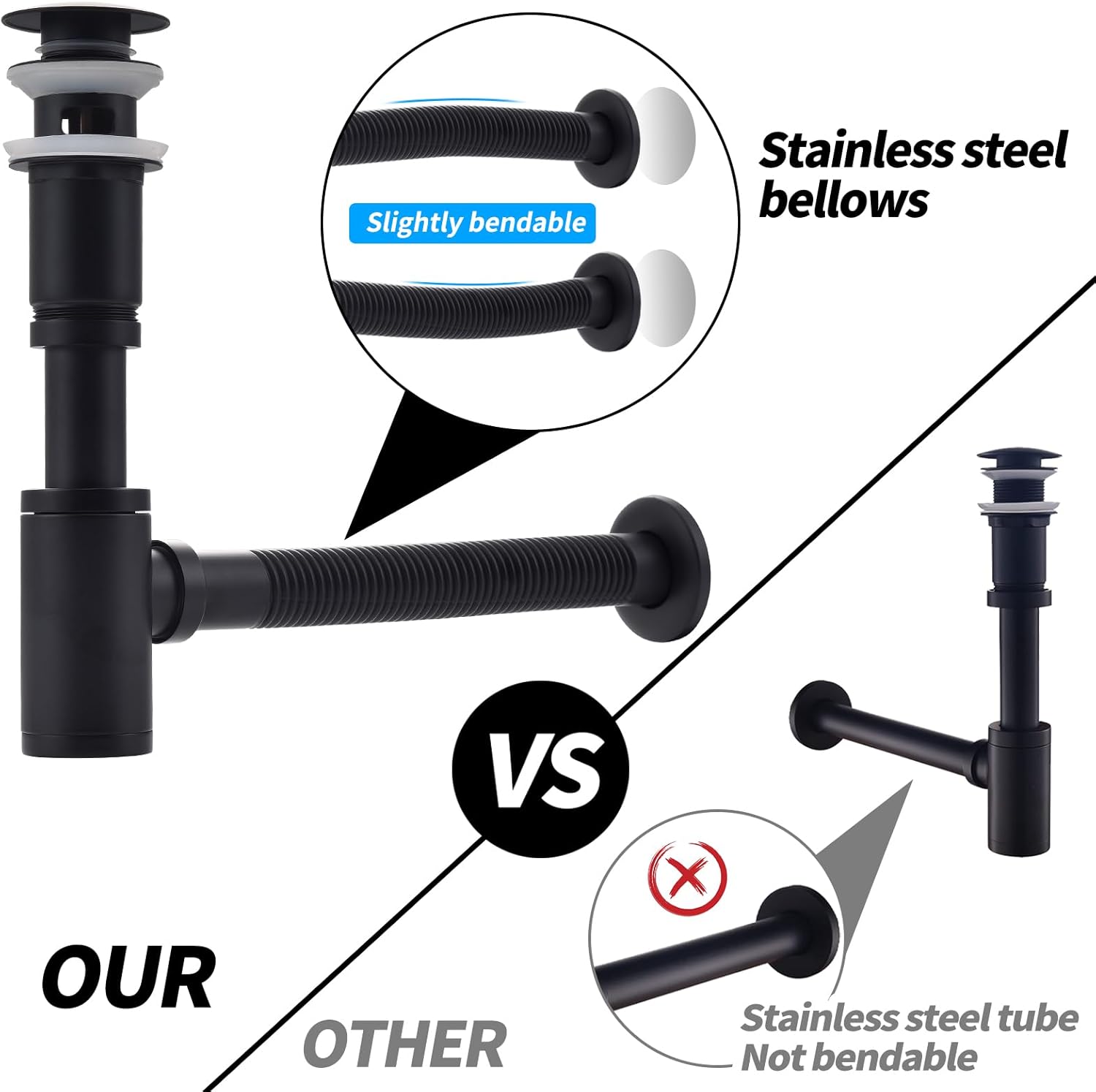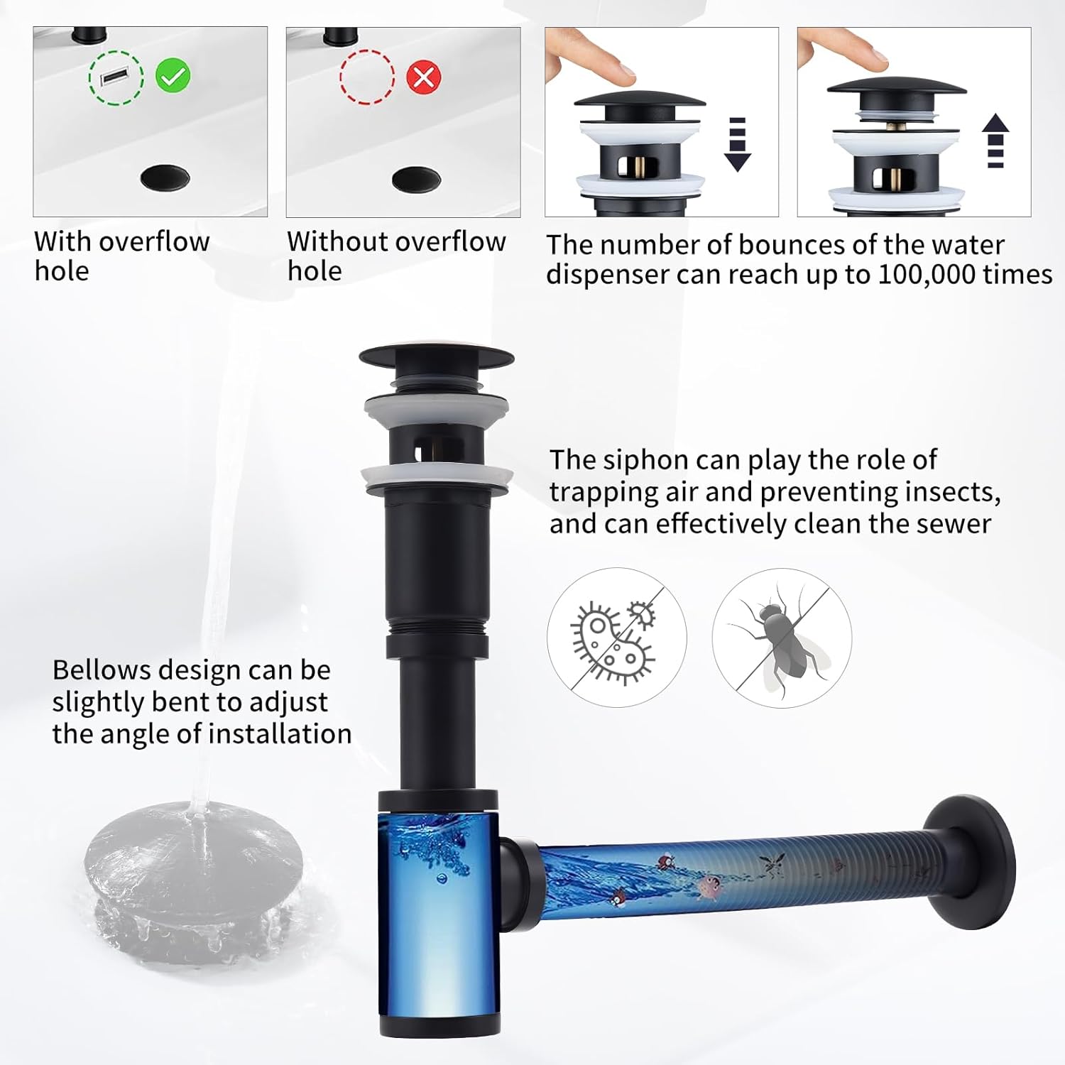 Ta visokokakovostni sifon s pop-up odtokom je izdelan iz trpežne medenine in nerjavečega jekla, odporen proti koroziji in primern za dolgotrajno uporabo. Vgrajeni filter in dvojni tesnilni sistemi preprečujejo zamašitve in puščanje, nastavljiva dolžina in gibljivost pa omogočata enostavno namestitev na različne umivalnike.