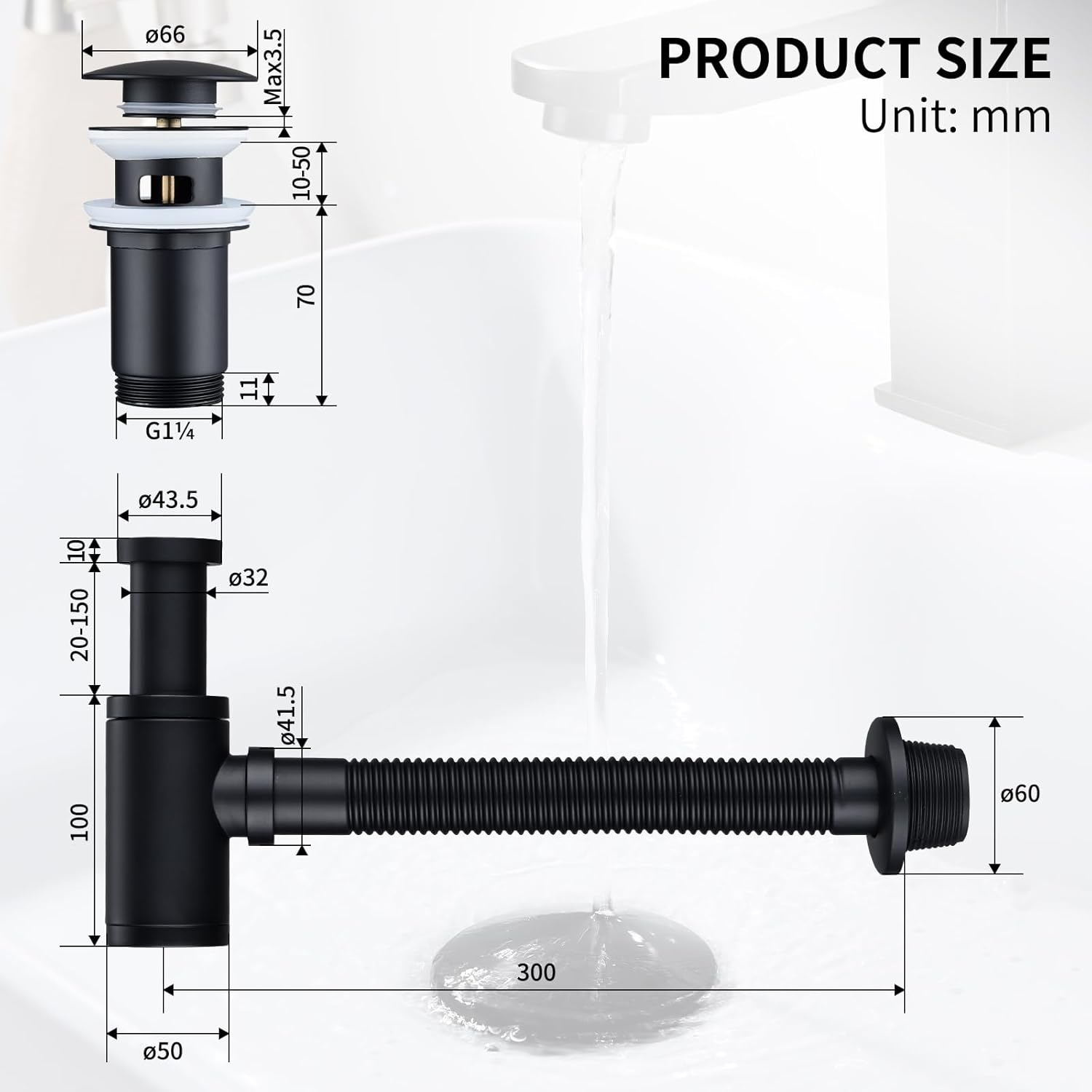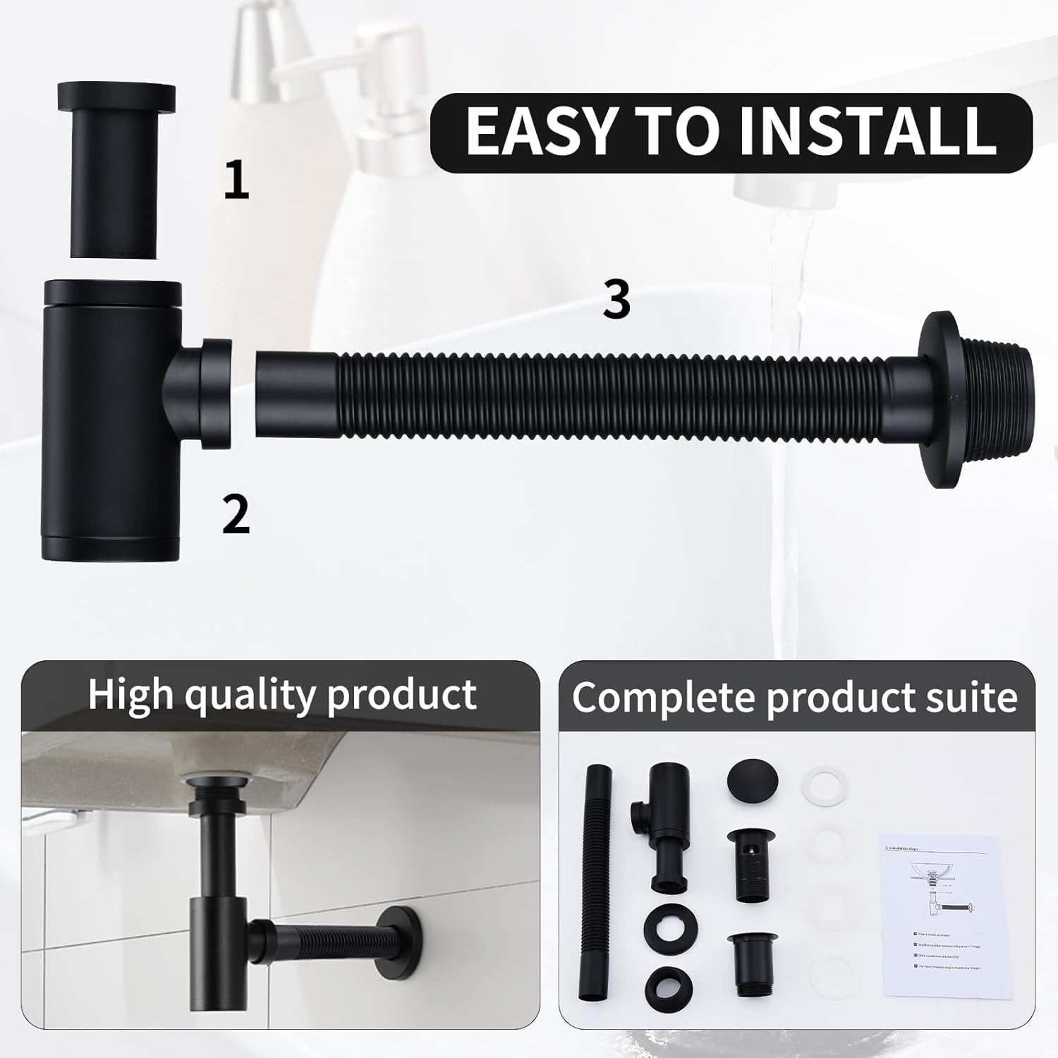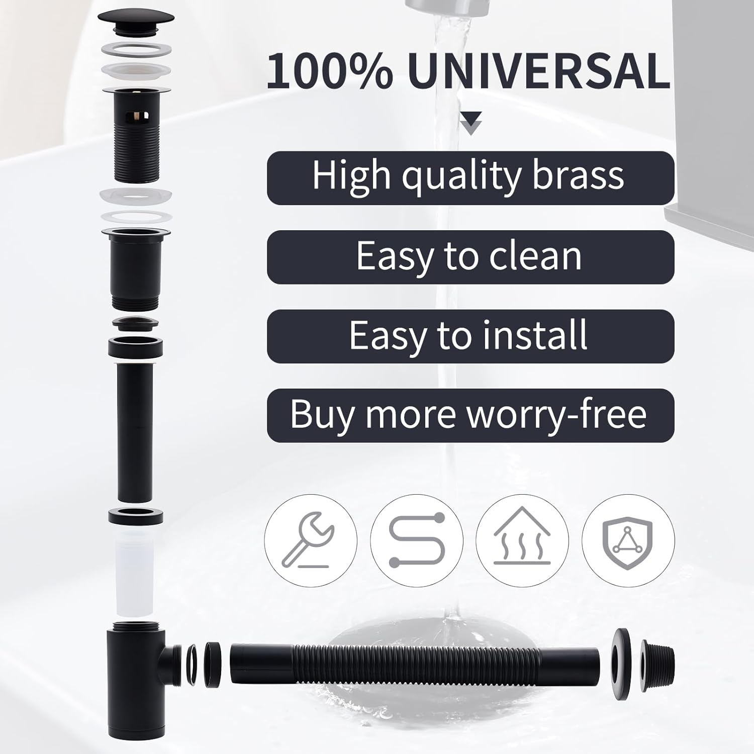 Enostavna montaža: Primerno za umivalnike z debelino 18–54 mm, enostavna prilagoditev dolžine sifona, vključena navodila za hitro namestitev.