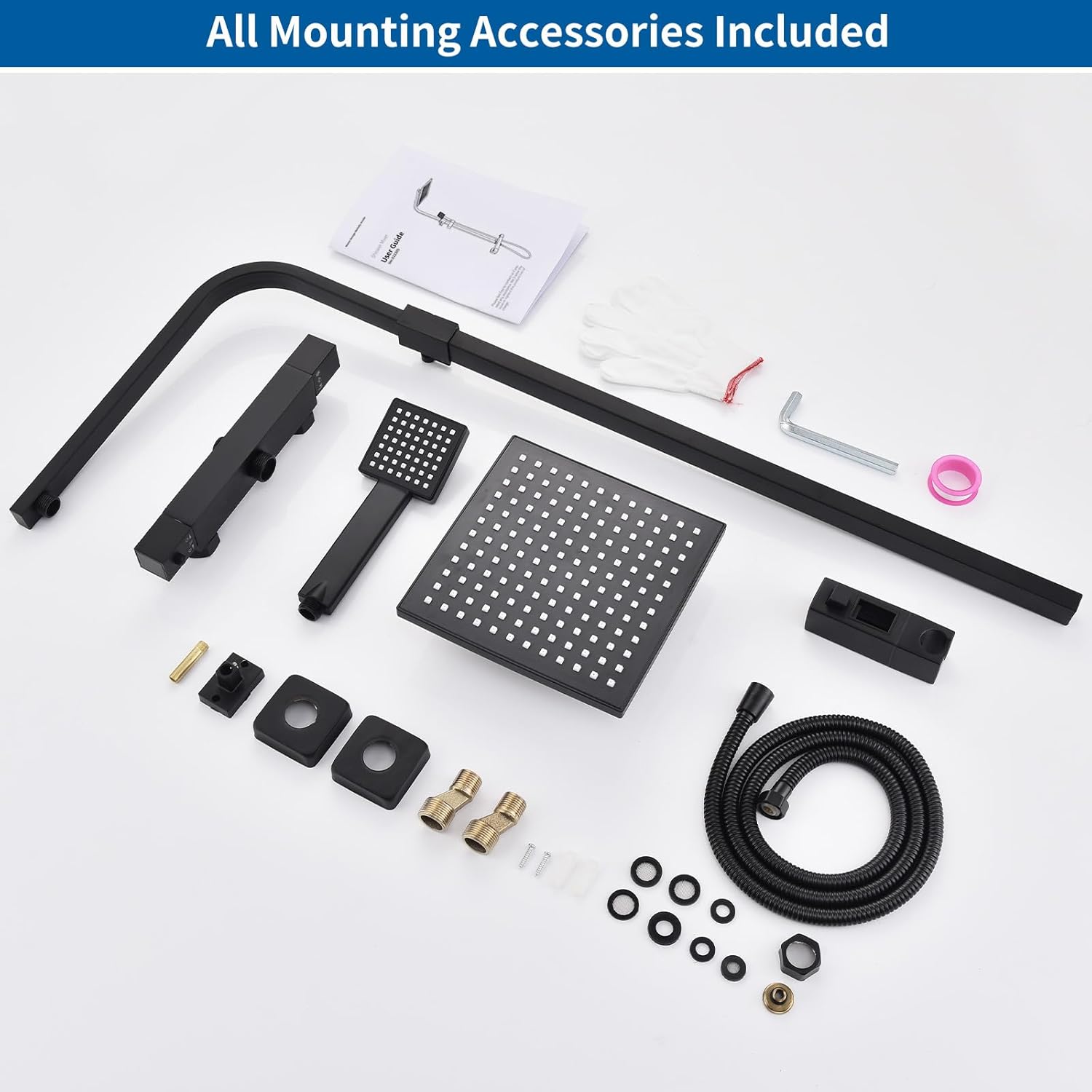 Vključeno v setu: Termostatska armatura, zgornja prha, ročna prha, nastavljiva letev, montažni material, teflonski trak in zaščitne rokavice