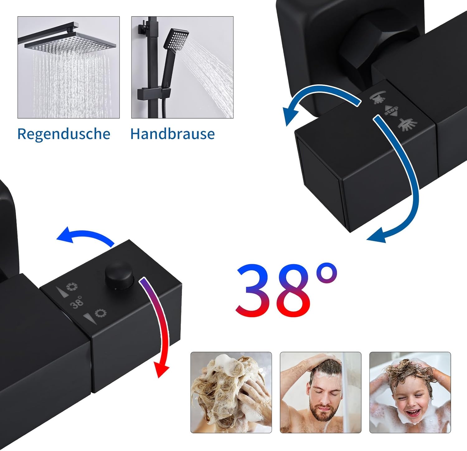 Tuš sistem v elegantni črni barvi združuje udobje, varnost in kakovostno izdelavo. Opremljen je s termostatsko armaturo z varnostno blokado pri 38 °C, kar zagotavlja stabilno temperaturo in zaščito pred opeklinami. Komplet vključuje veliko dežno prho, ročno prho in nastavljivo tuš letvijo, primerno za uporabnike vseh višin.