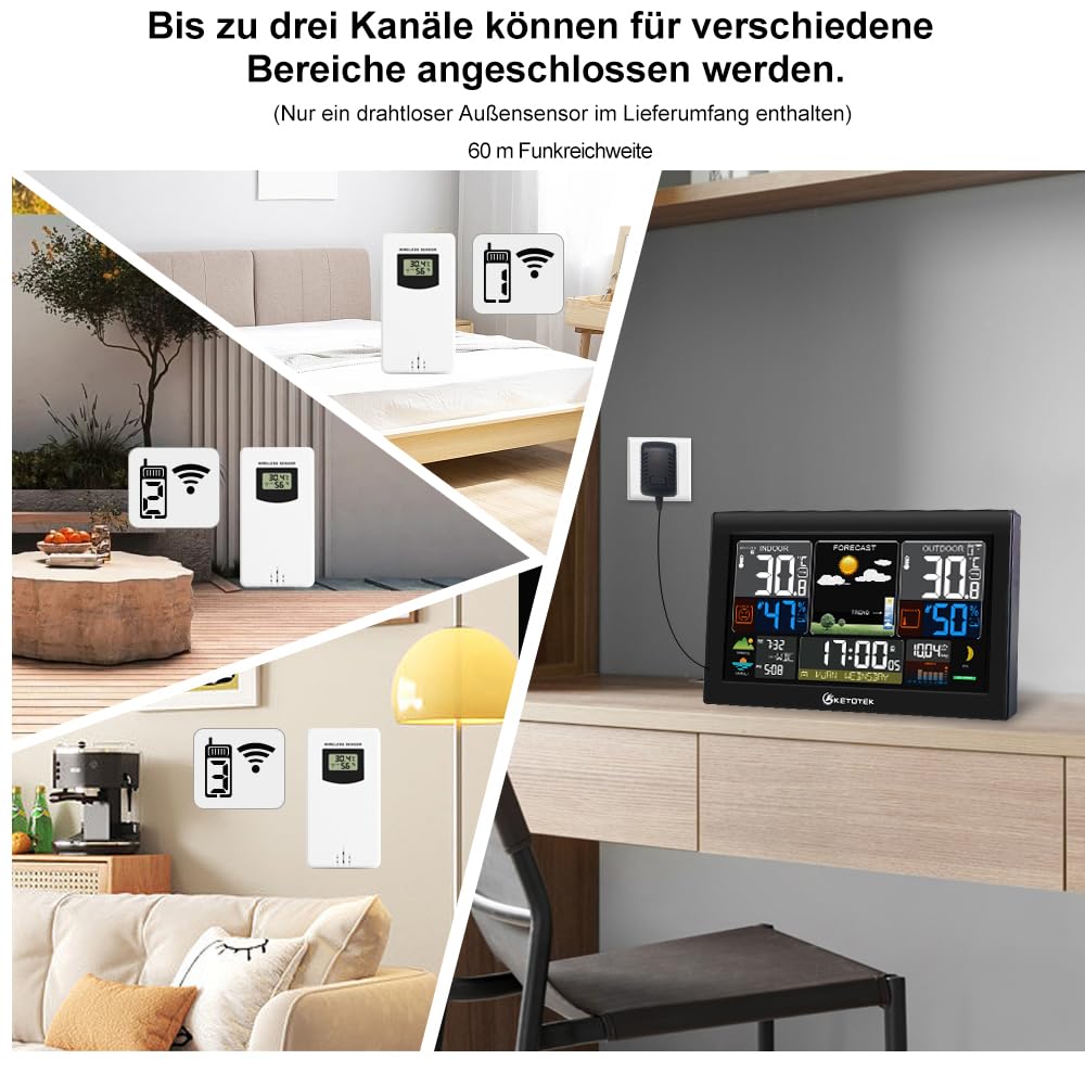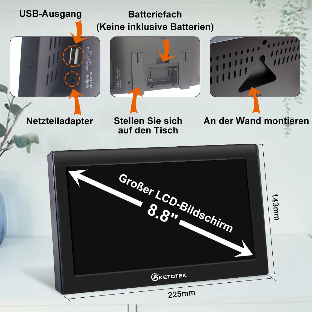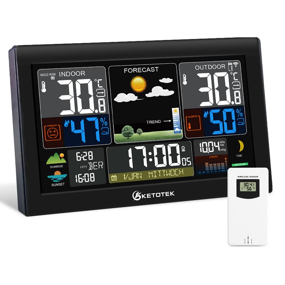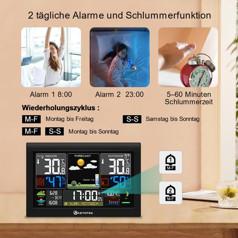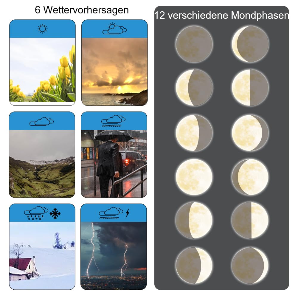 Vremenska postaja ponuja izjemno natančno merjenje notranje in zunanje temperature ter vlage, hkrati pa vključuje napredne funkcije, kot so vremenska napoved, faze lune, prikaz sončnega vzhoda in zahoda ter radijsko voden čas. Velik 8,8-palčni HD barvni zaslon zagotavlja odlično berljivost iz vseh kotov, zato je primeren tudi za starejše.