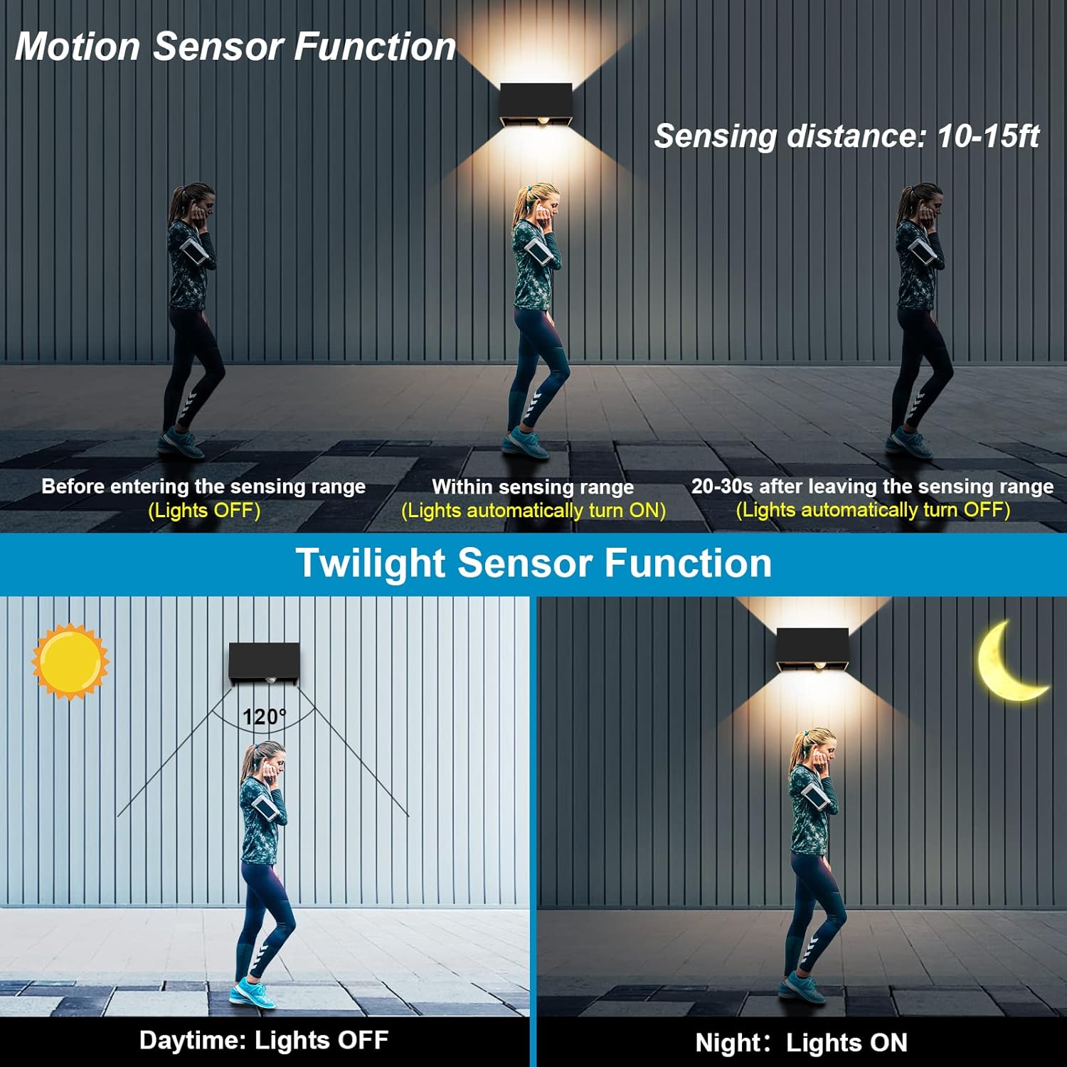 Pametno delovanje: Senzor gibanja zazna prisotnost ljudi in samodejno prižge svetlobo; senzor mraka prepreči delovanje podnevi.