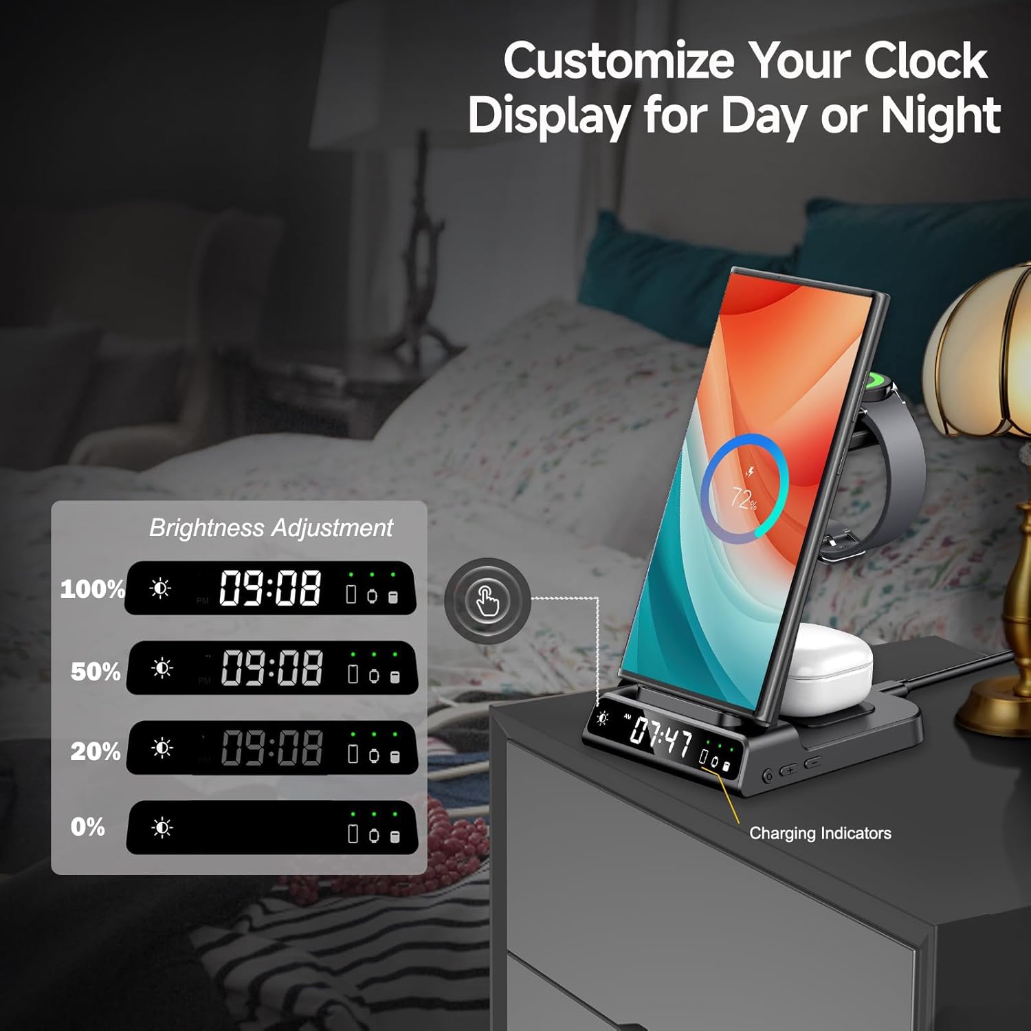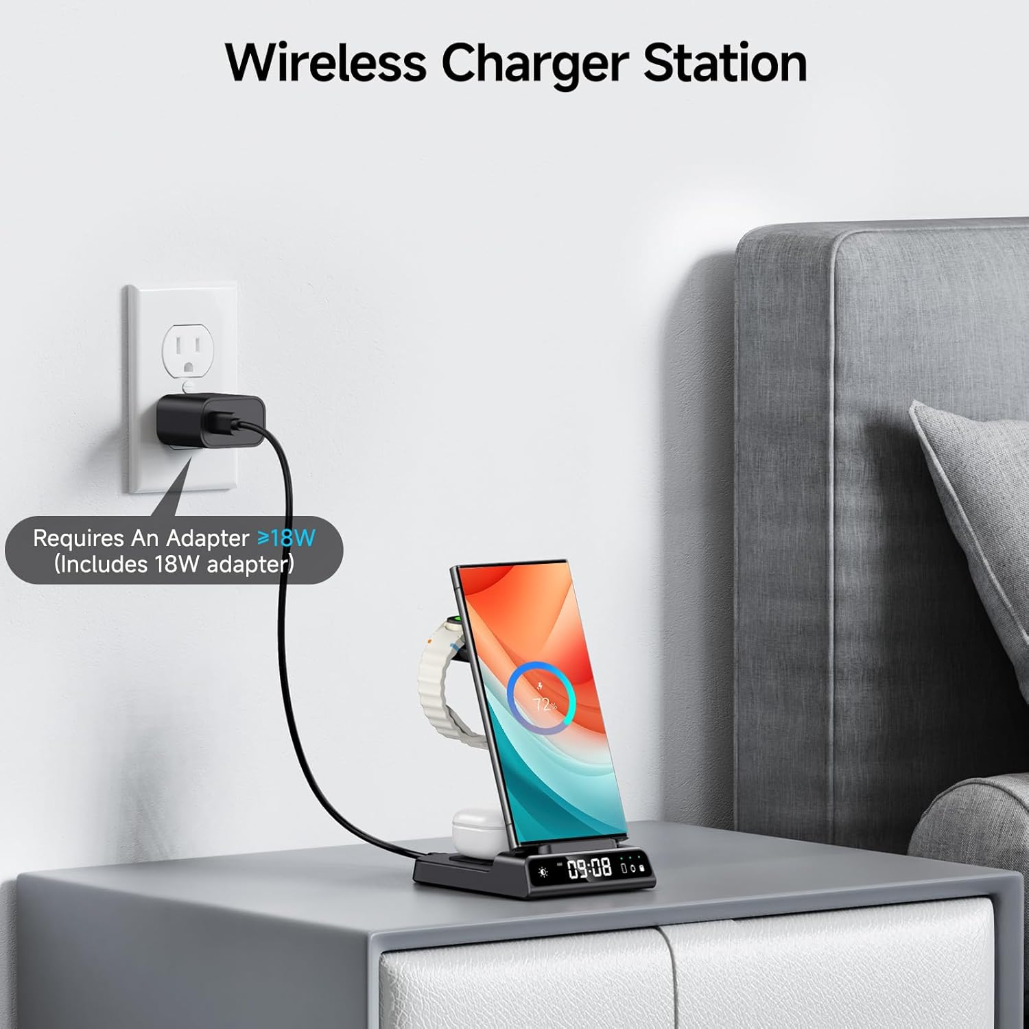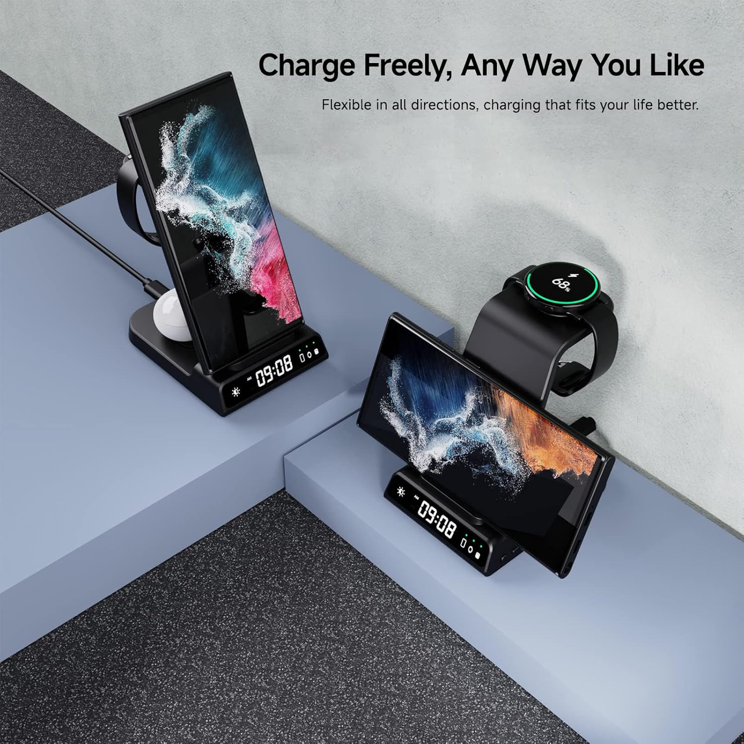 Ta 3-v-1 indukcijska polnilna postaja omogoča brezžično polnjenje pametnih telefonov Samsung. Postaja omogoča polnjenje telefonov horizontalno ali vertikalno, hkrati pa služi kot stojalo za ogled videov ali brskanje po spletu.