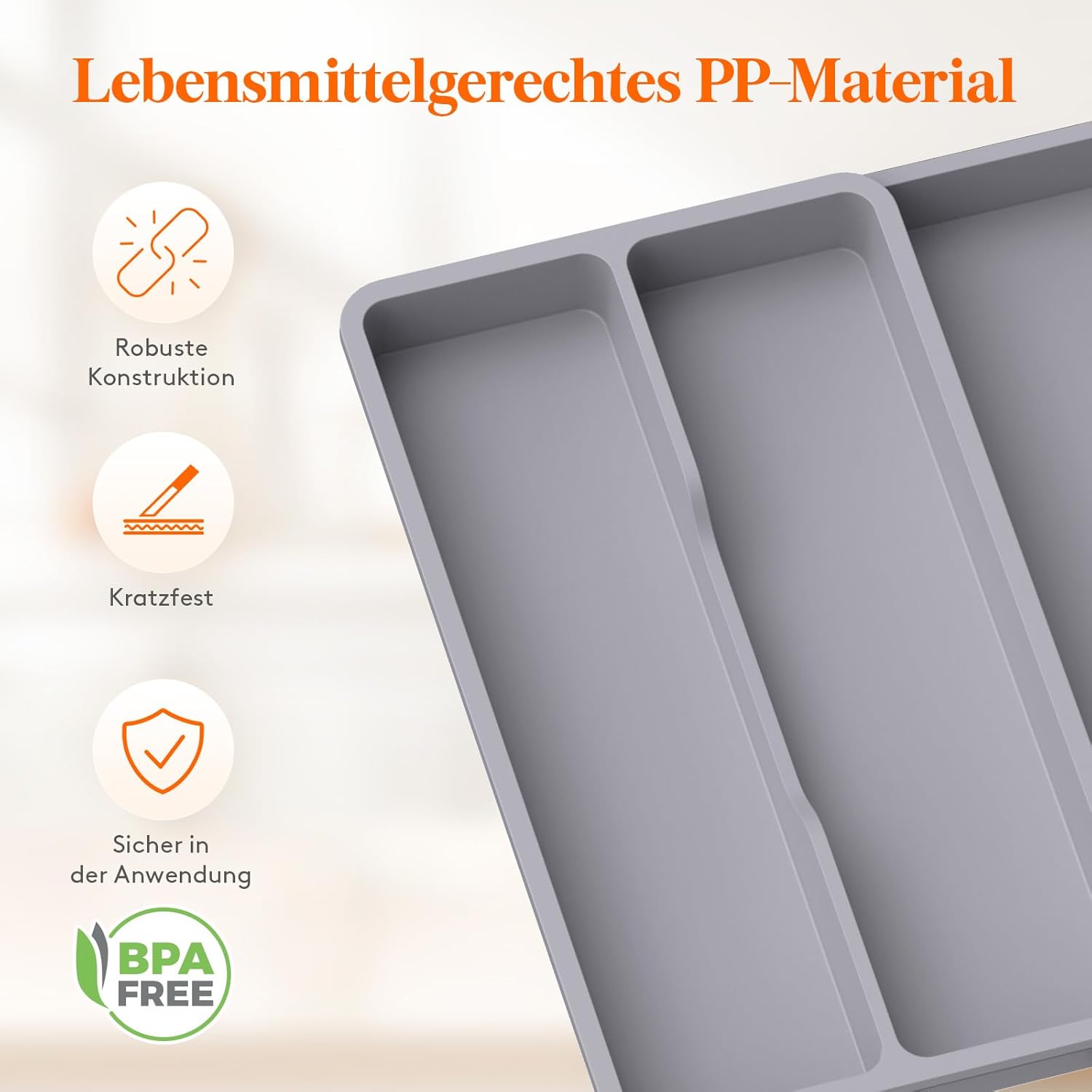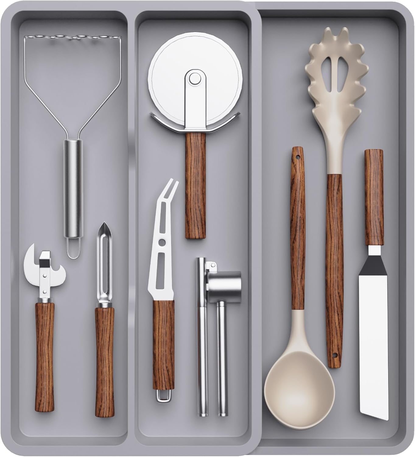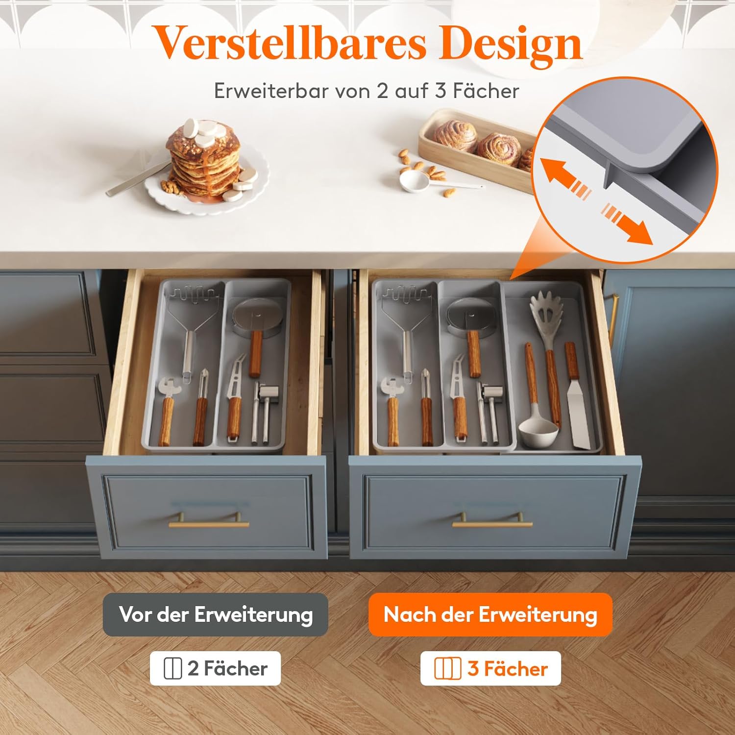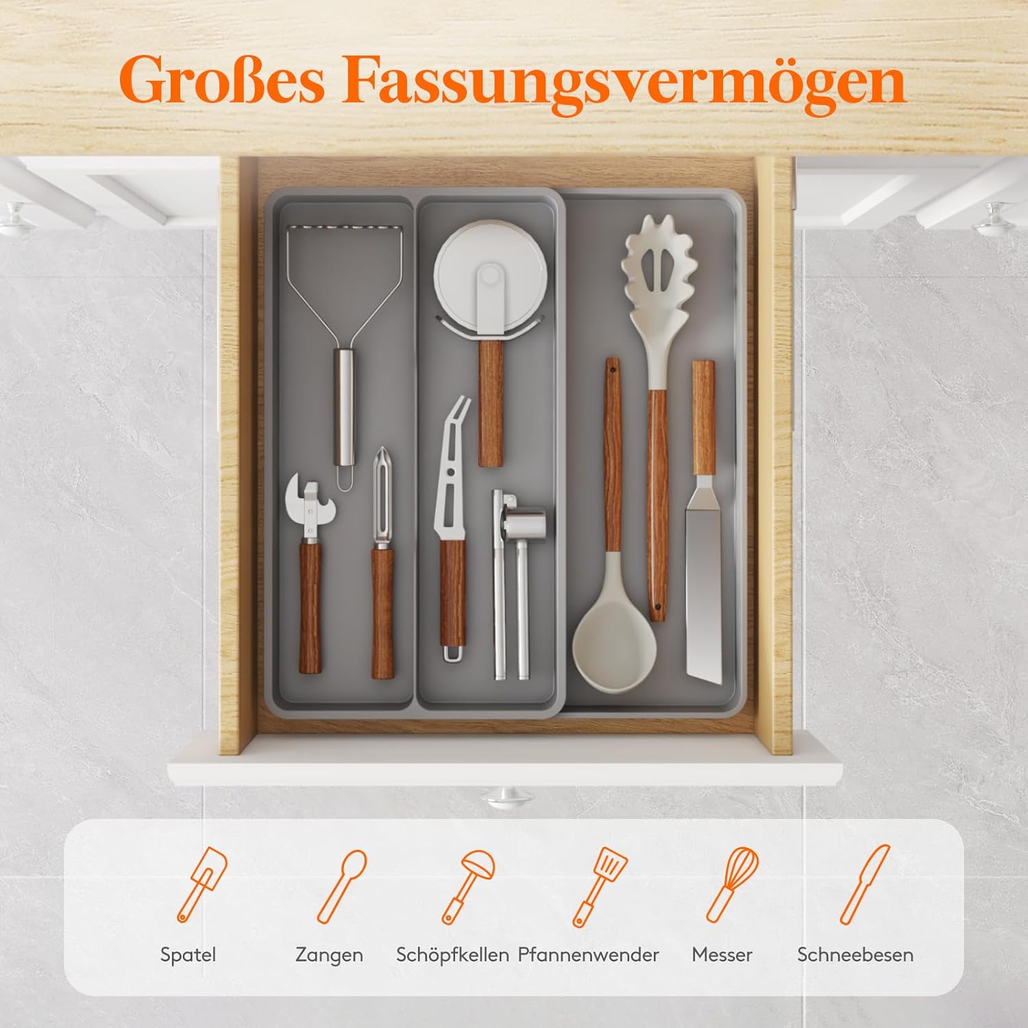 Velika kapaciteta – 2 večja predelka in 1 stranski raztegljiv predel za spatule, nože, žlice, klešče in druge kuhinjske pripomočke;