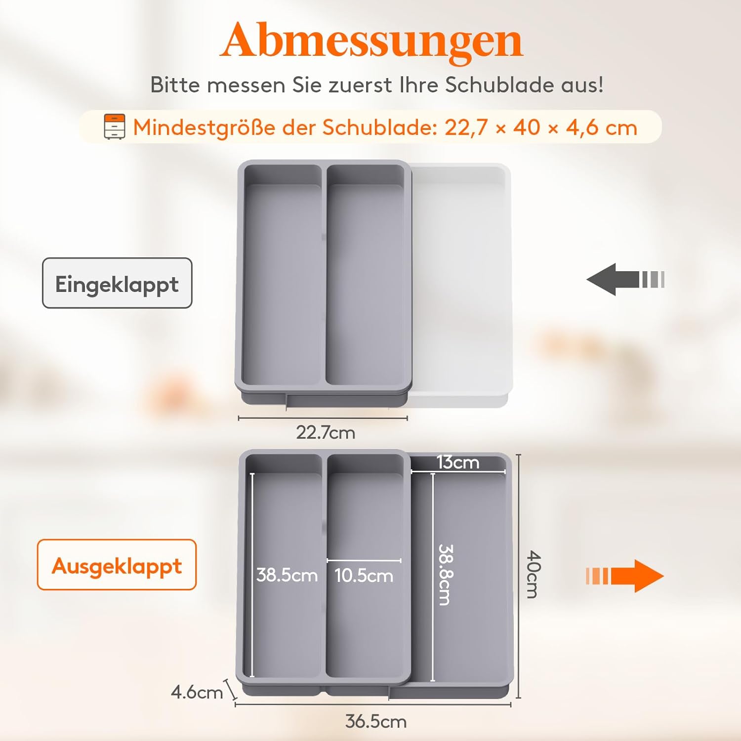 Raztegljiv dizajn – širina se prilagodi od 22,7 do 36,5 cm za popolno prileganje različnim predalom;