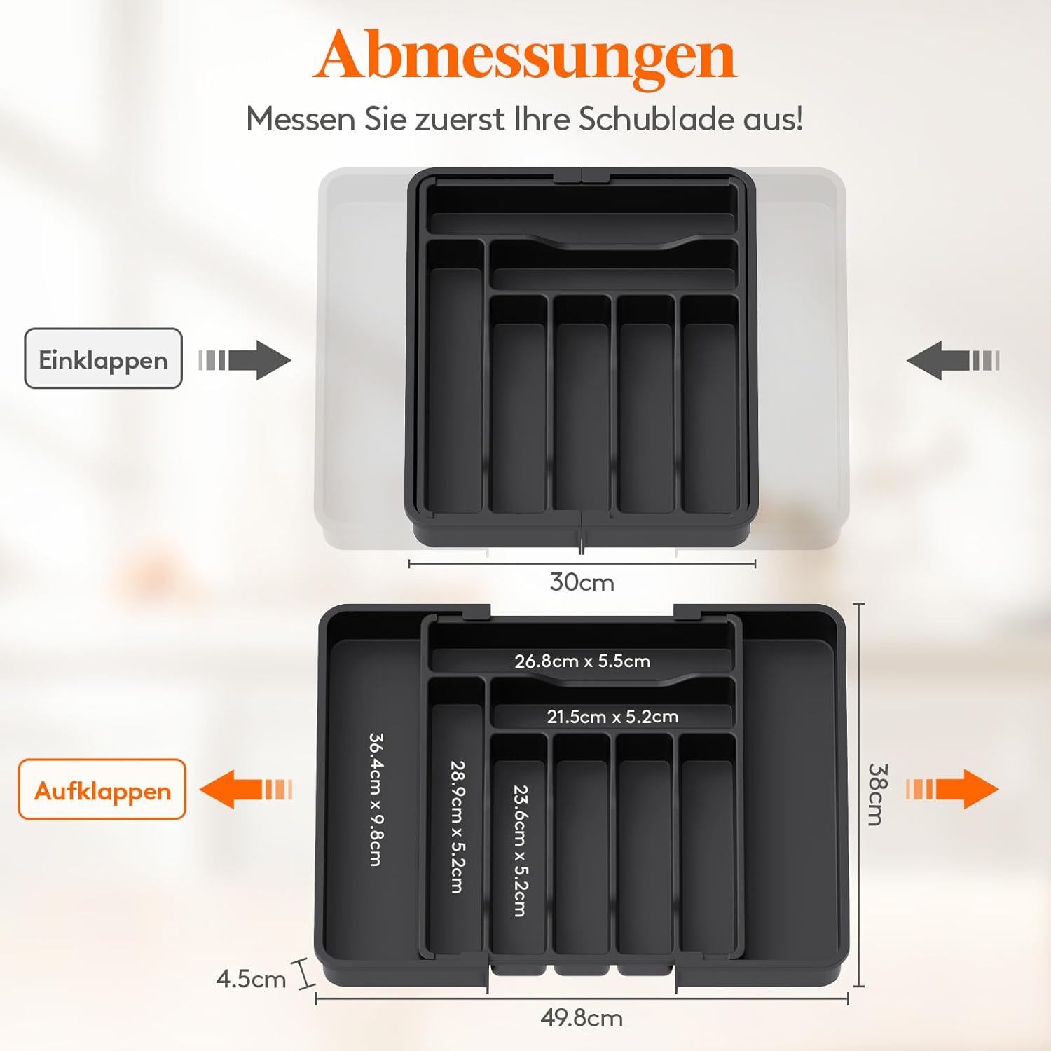 Raztegljiva zasnova: širina se prilagodi predalu od 30 do 50 cm – idealno za skoraj vse kuhinjske predale.