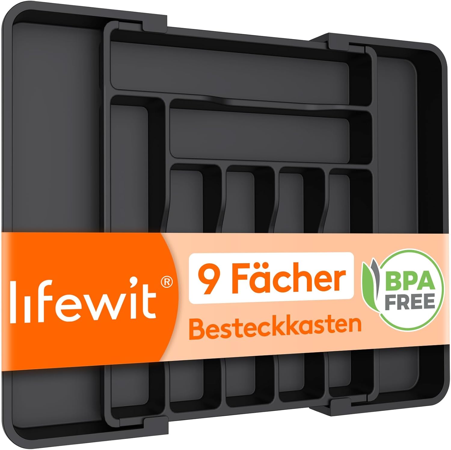 Nastavljiv pladenj za pribor je popolna rešitev za urejene kuhinjske predale. Z raztegljivo širino od 30 do 50 cm, 9 razdelki in trpežno, živilsko varno plastiko omogoča maksimalen izkoristek prostora ter pregledno shranjevanje žlic, vilic, nožev, kuhinjskih pripomočkov ali drugih manjših predmetov v domu.