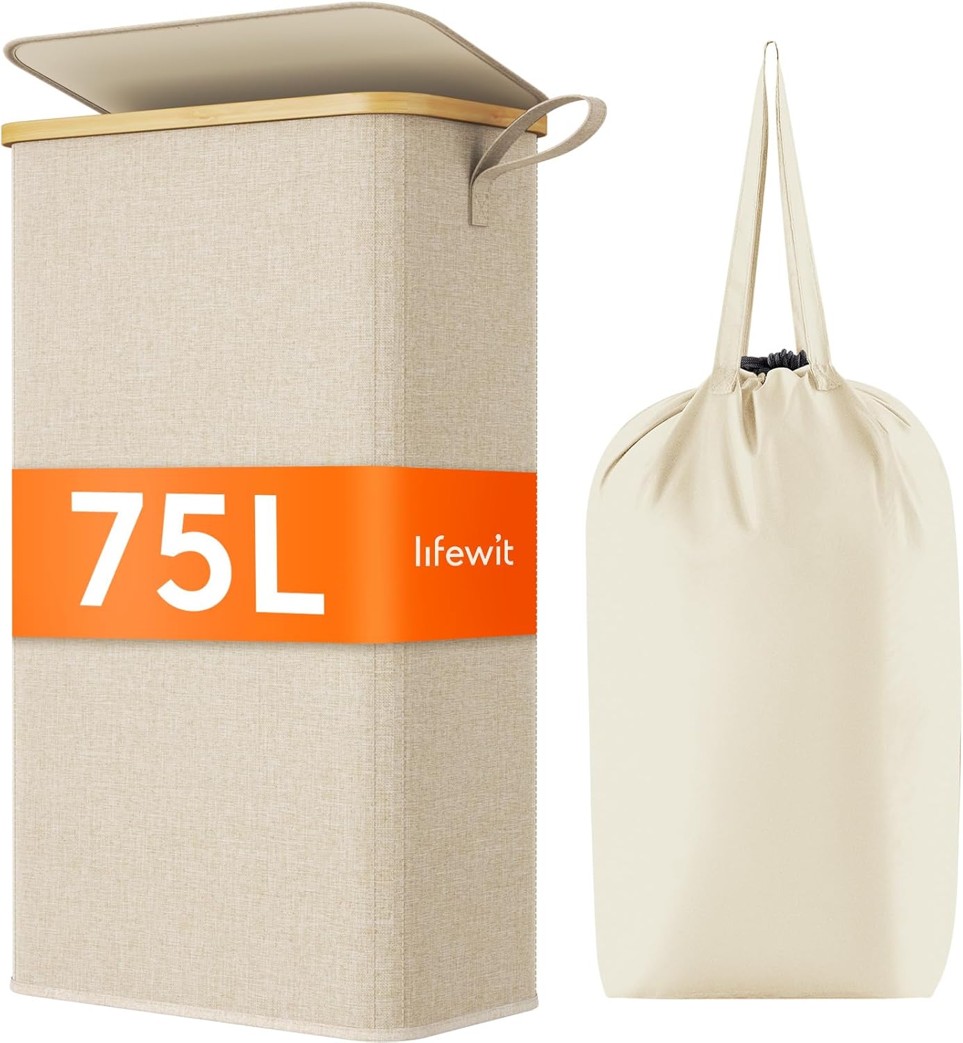 LIFEWIT zložljiv ozek koš za perilo s pokrovom in snemljivo notranjo vrečo – 75 L