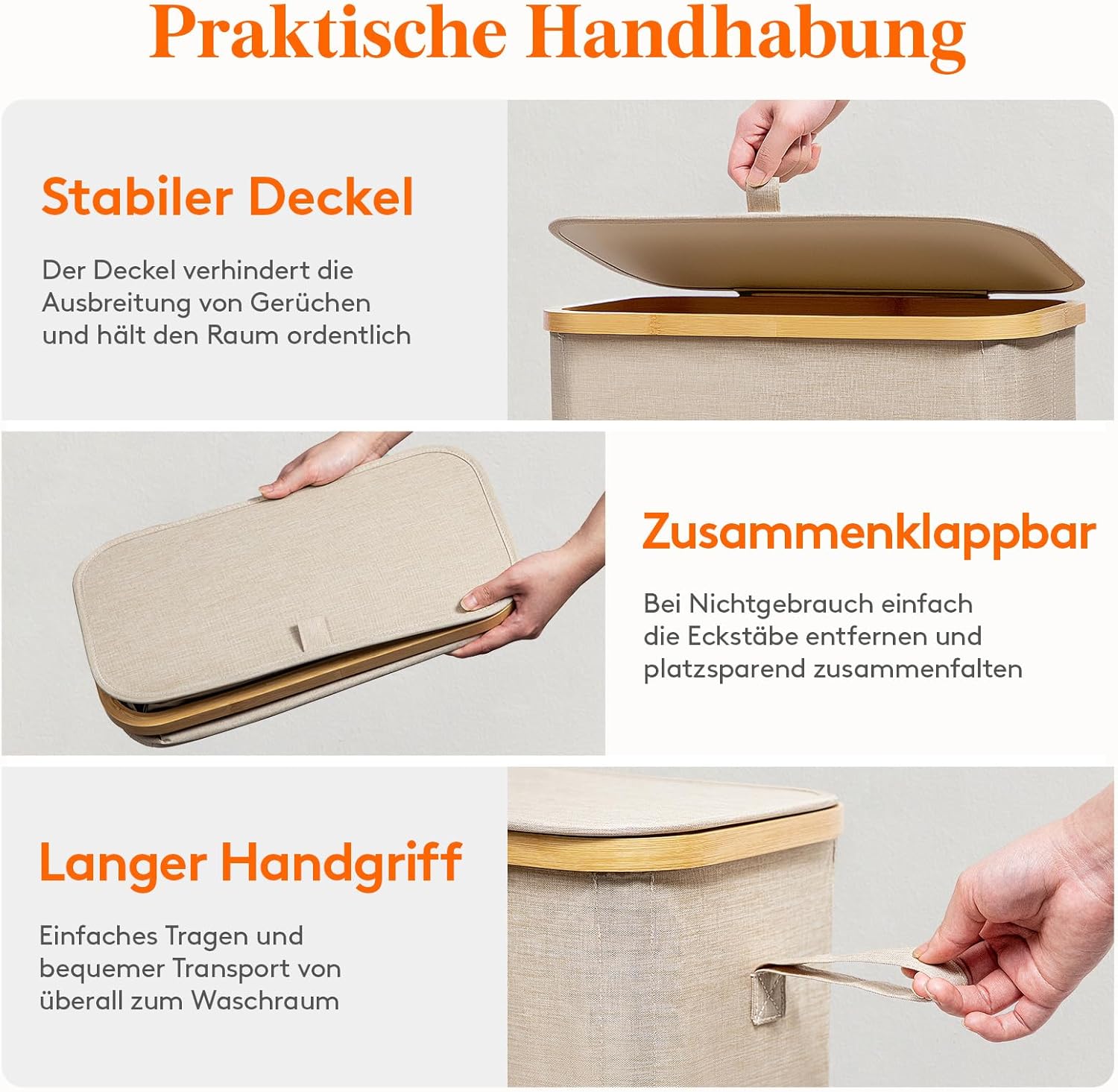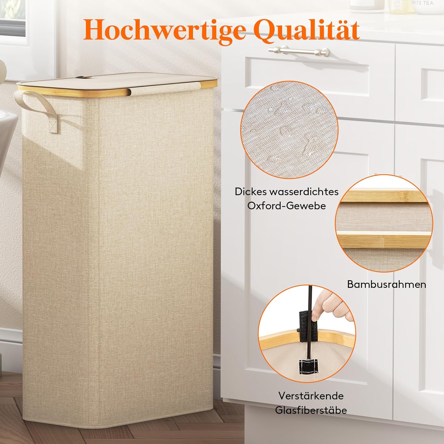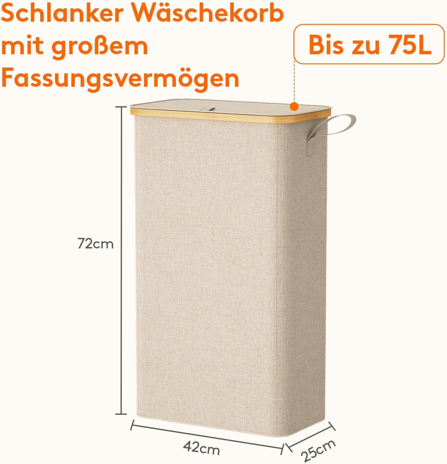 75-litrski ozek koš za perilo je idealna rešitev za majhne prostore, kot so kopalnice, spalnice, garderobe ali študentske sobe. Z modernim dizajnom, trdnim bambusovim okvirjem in snemljivo pralno vrečo omogoča praktično in estetsko shranjevanje perila, hkrati pa ohranja prostor čist in urejen.