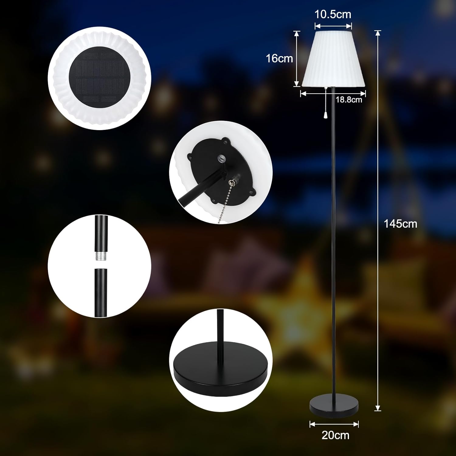 Solarna stoječa svetilka združuje funkcionalnost in dekorativni učinek za notranje ali zunanje prostore. Z LED tehnologijo, senzorjem svetlobe in možnostjo dveh načinov polnjenja (sončna energija ali USB) ponuja prilagodljivo osvetlitev brez kablov. Svetilka omogoča izbiro med 16 barvami, toplo belo svetlobo (3000 K) ter funkcijo utripajoče sveče za prijetno ambientalno vzdušje.