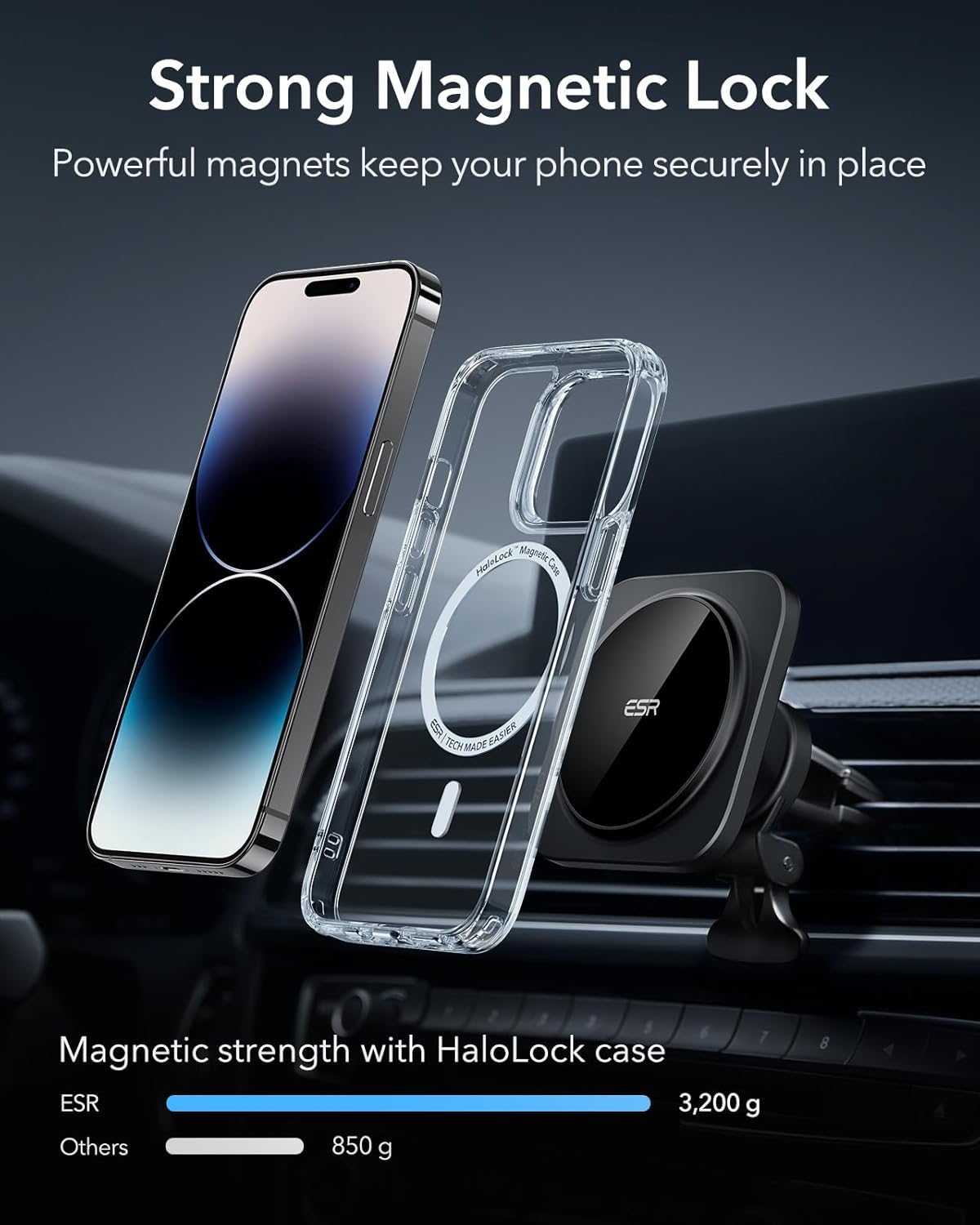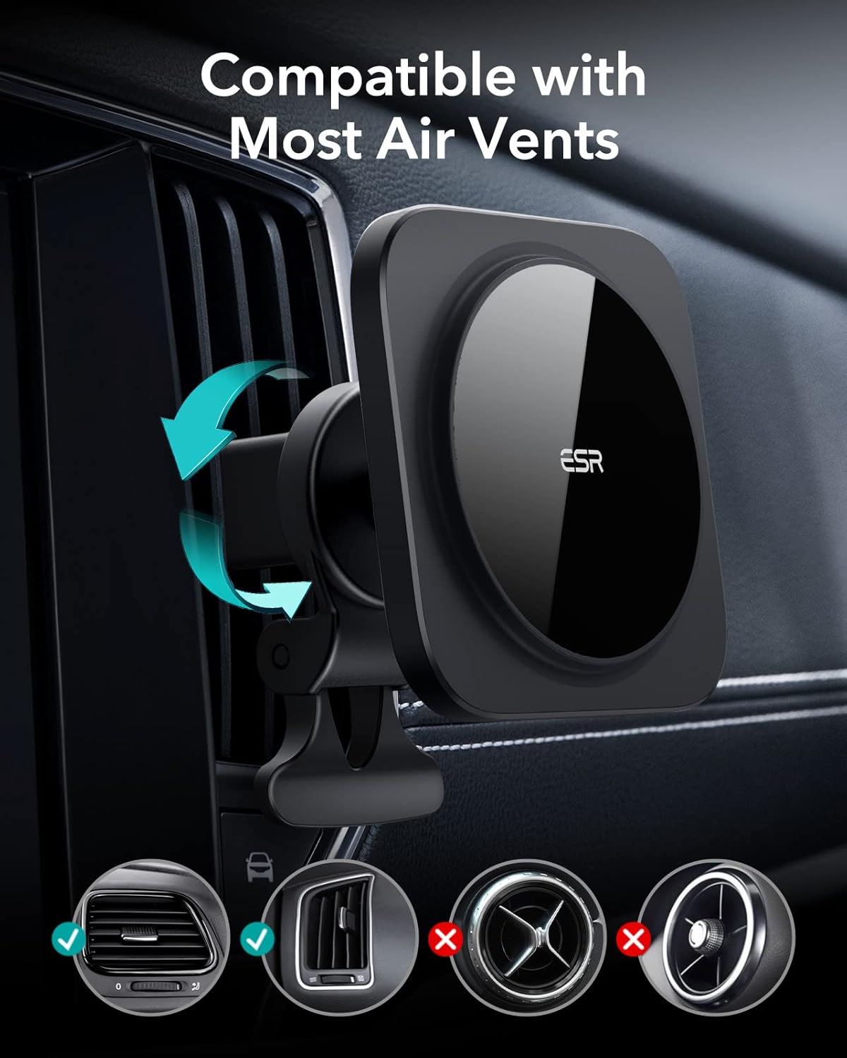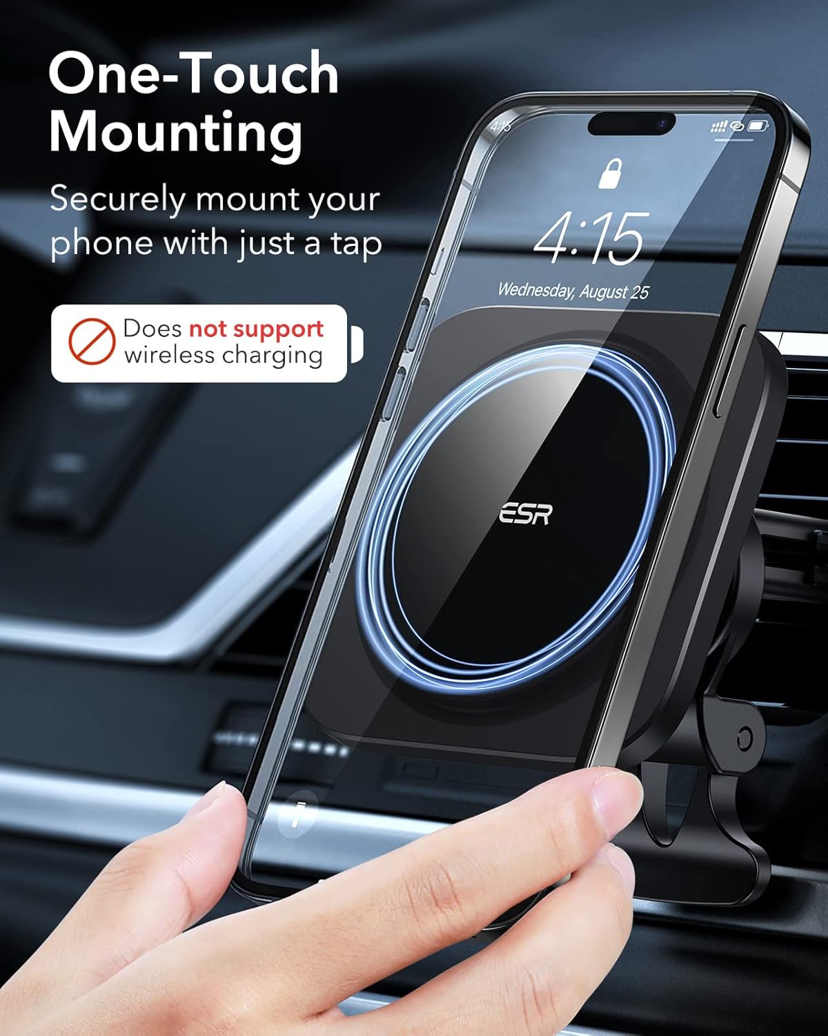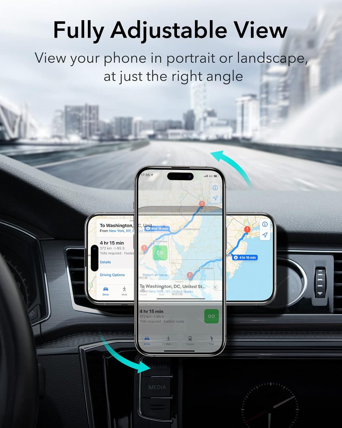Avtomobilski nosilec omogoča enostavno magnetno pritrditev vašega telefona na prezračevalno režo v avtomobilu. Nosilec zagotavlja stabilnost in varen oprijem tudi na neravnih cestah, omogoča hitro preklapljanje med portretnim in ležečim načinom ter je združljiv z najnovejšimi iPhone in Galaxy modeli.