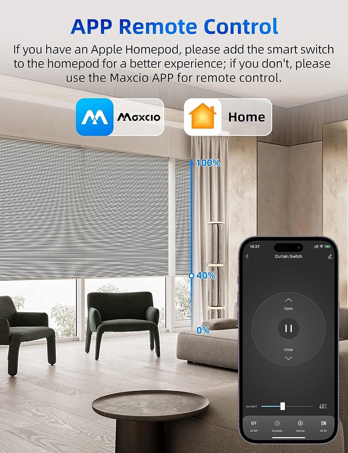 Pametno stikalo Maxcio HomeKit Roller Shutter prinaša popolno kombinacijo sodobne tehnologije, natančnega nadzora in enostavne uporabe – idealno za digitalno avtomatizacijo zaves, rolet ali senčil v pametnem domu.