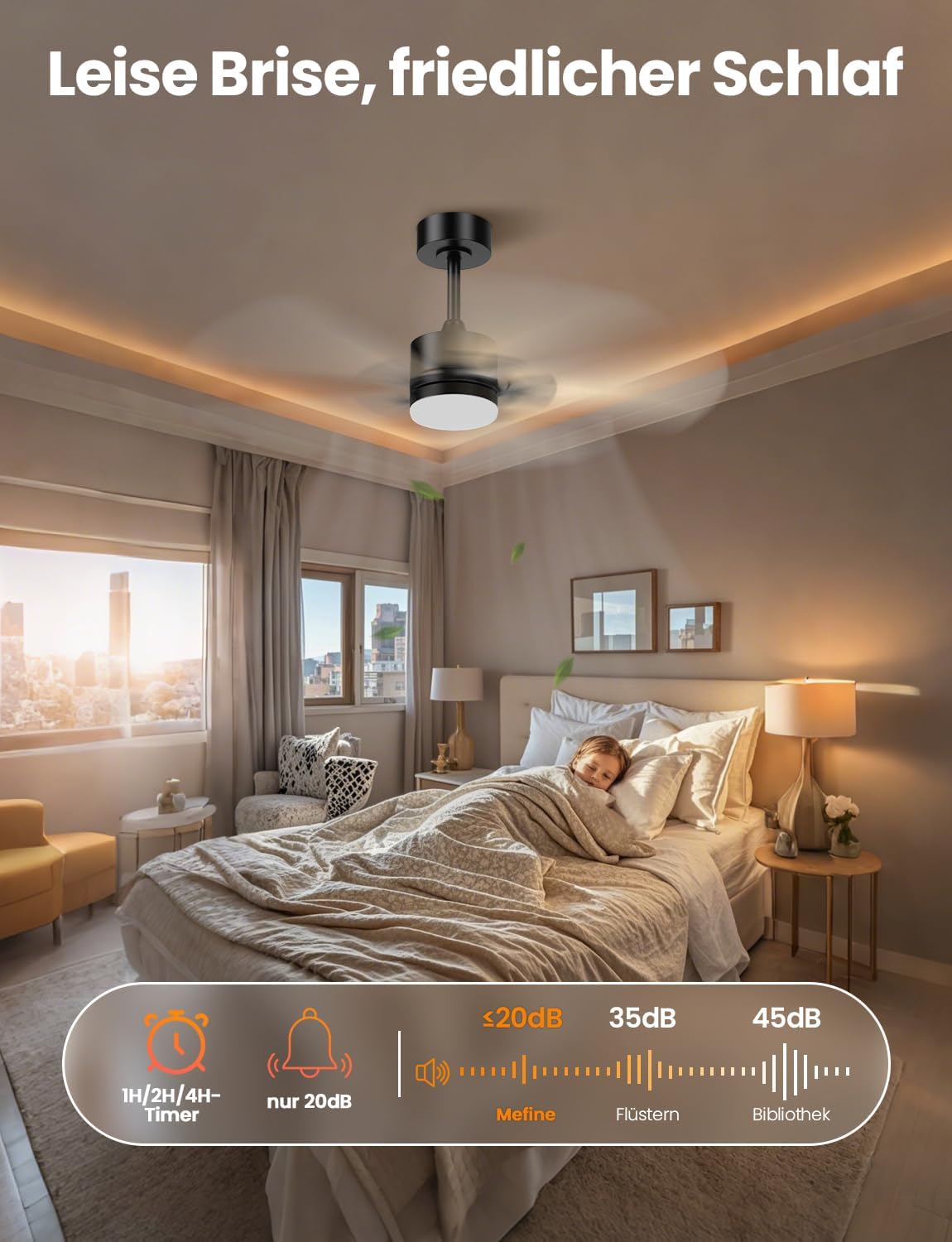 Izjemno tiho delovanje: napredni DC motor deluje skoraj neslišno, kar je idealno za spalnice, otroške sobe in domače pisarne.