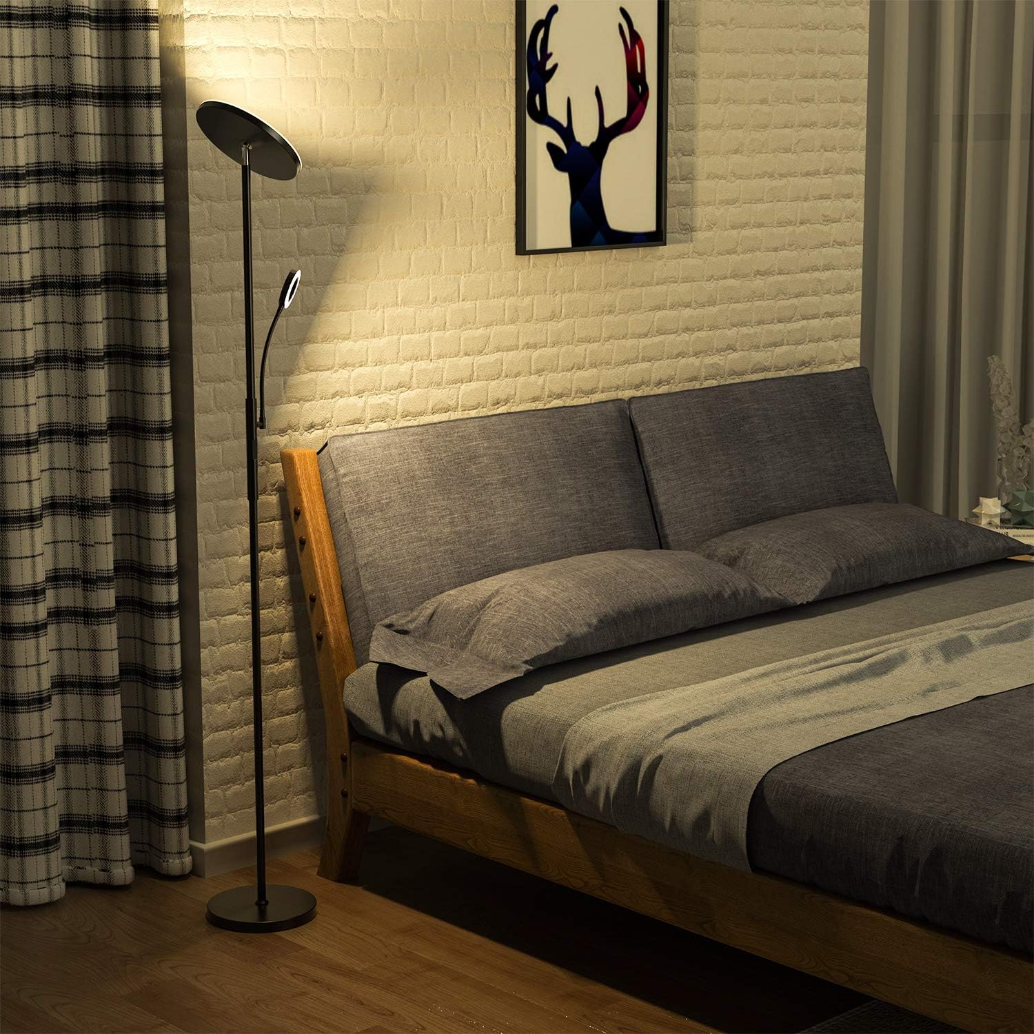 Zmogljiva in vsestranska talna svetilka, ki združuje glavno svetlobo in prilagodljivo bralno svetilko z več barvnimi temperaturami in zatemnitvijo.