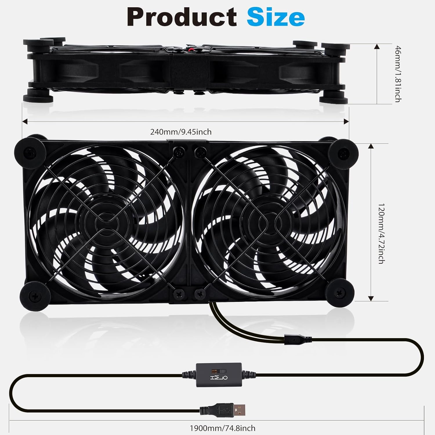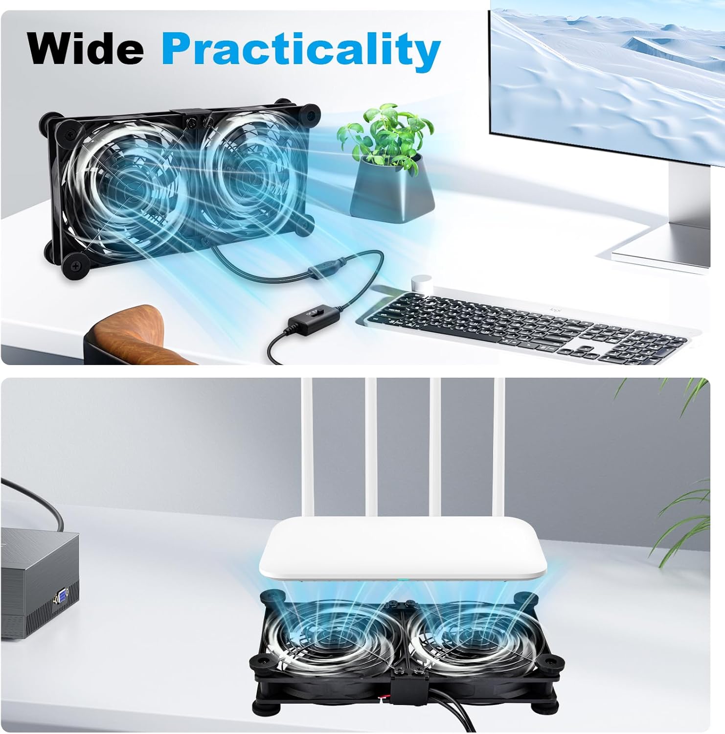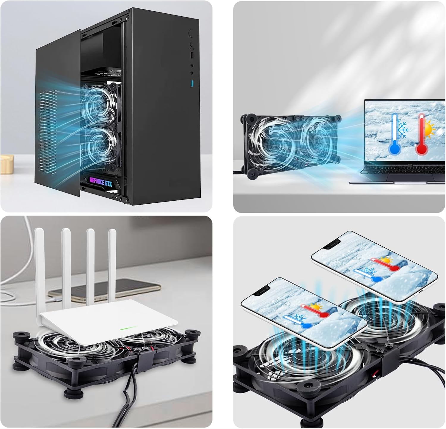 Kompakten in tih dvojni ventilator zagotavlja učinkovito hlajenje elektronskih naprav, kot so usmerjevalniki, igralne konzole, TV sprejemniki, DVR-ji ali prenosniki. Opremljen je s 3-stopenjskim regulatorjem hitrosti, kakovostnimi dvojnimi krogličnimi ležaji in tihim delovanjem, kar omogoča dolgotrajno, stabilno in skoraj neslišno uporabo.