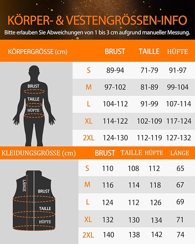 Ogrevani telovnik za moške združuje sodobno tehnologijo ogrevanja in udoben dizajn za popolno zaščito v hladnih zimskih dneh. S 7,4 V 20000 mAh baterijo zagotavlja do 13 ur toplote, 8 grelnih con pa enakomerno segreje ključne dele telesa – vrat, hrbet, ramena, trebuh in pas. Vodoodporna zunanja plast, mehka podloga pri vratu ter praktični žepi poskrbijo za udobje in funkcionalnost med športom, delom ali prostim časom na prostem.
