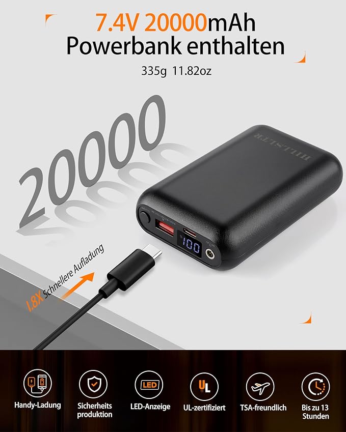 Dolgotrajna toplota: Močna baterija omogoča do 13 ur neprekinjenega ogrevanja, kar je idealno za celodnevne aktivnosti na prostem.