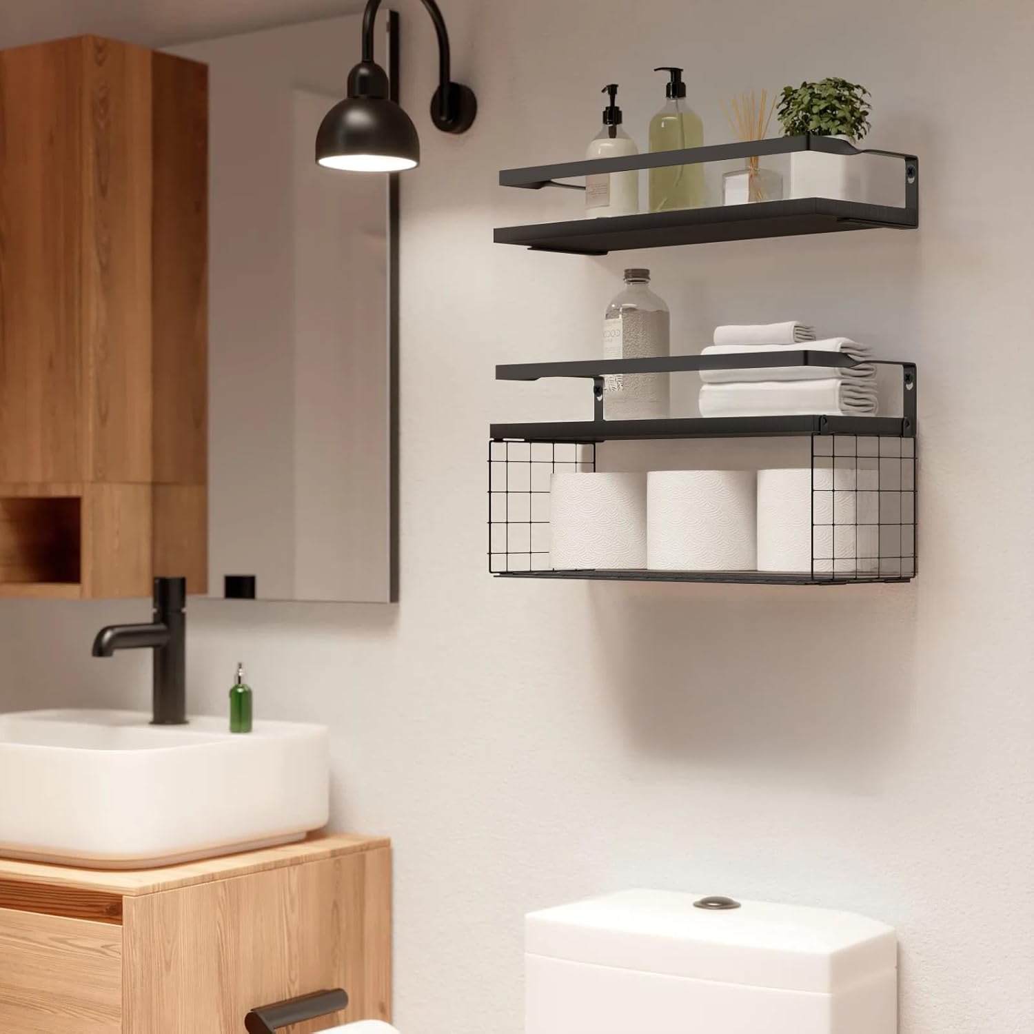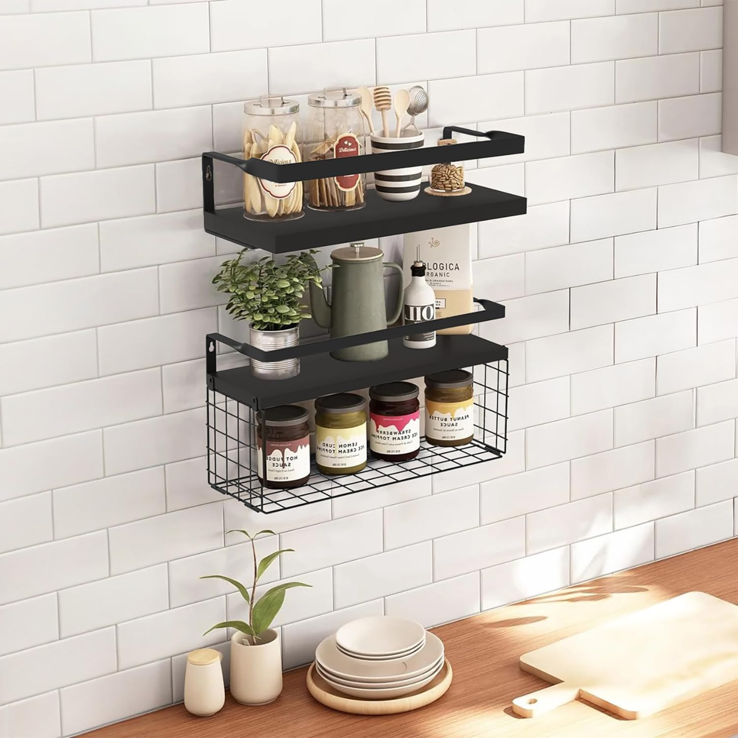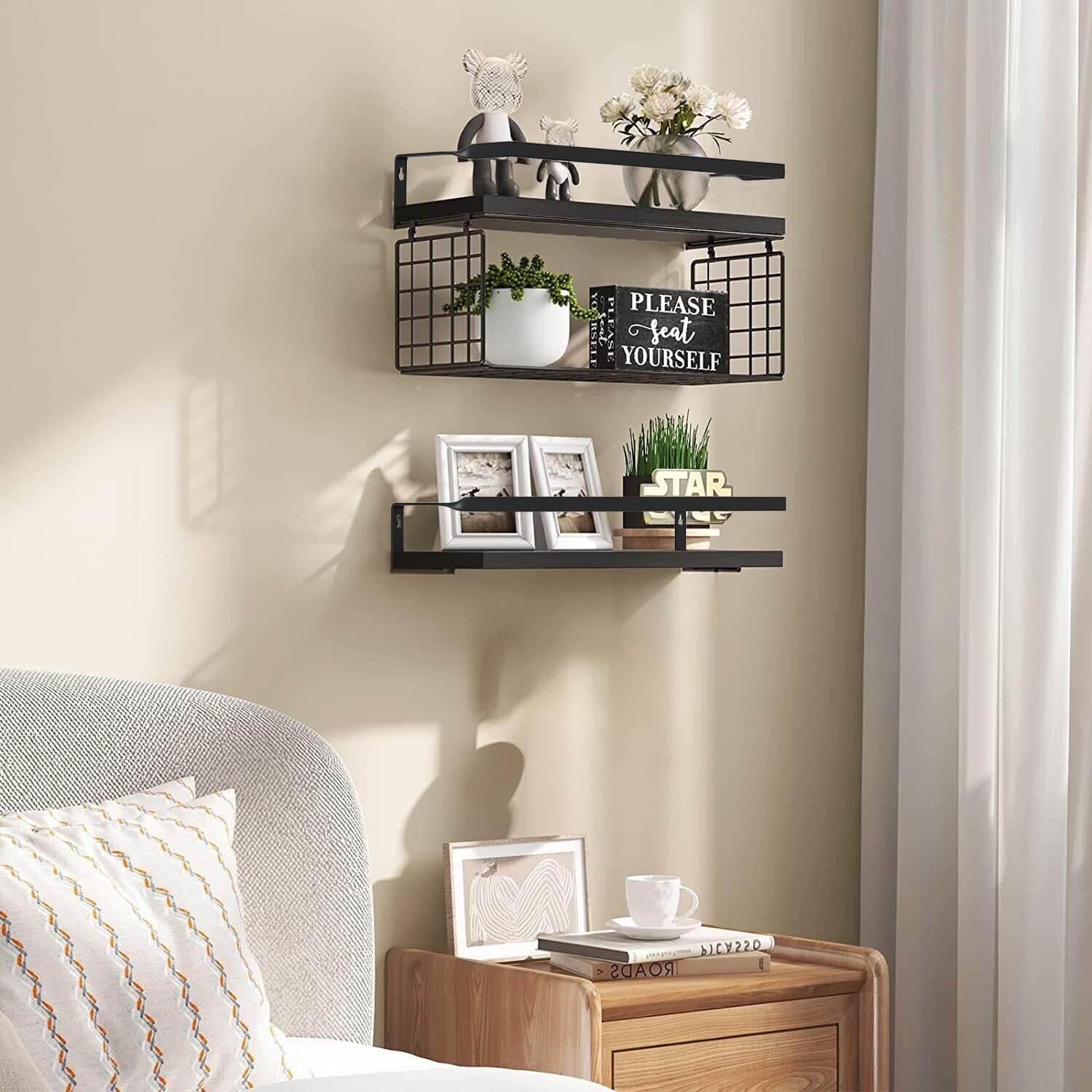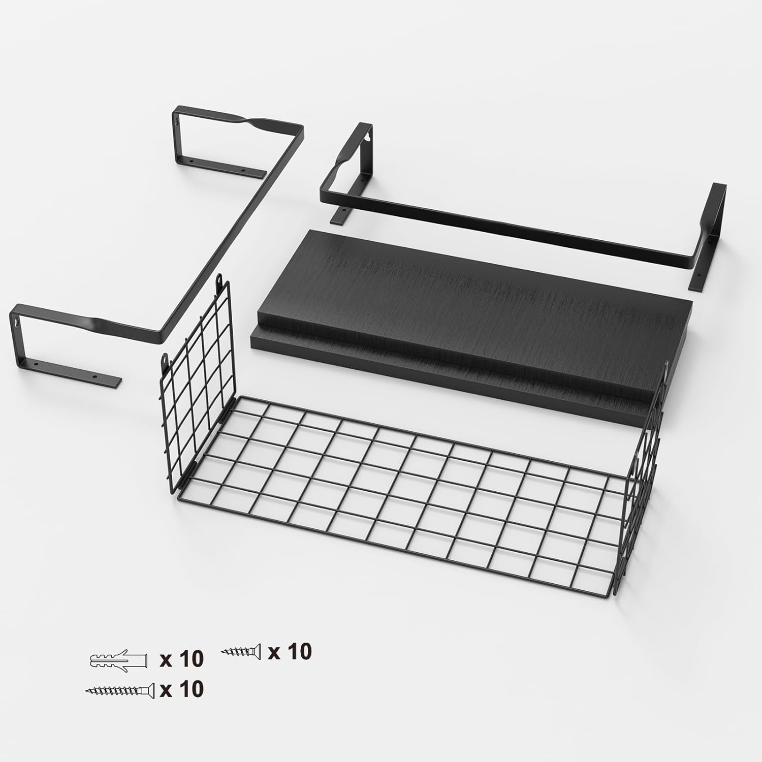 Ta komplet dveh minimalističnih črnih plavajočih polic združuje funkcionalnost, eleganten videz in trpežne materiale. Izdelane so iz kakovostnega borovega lesa, pod njimi pa je nameščen kovinski žični koš s prašno prevleko, ki je odporen proti rji in praskam.
