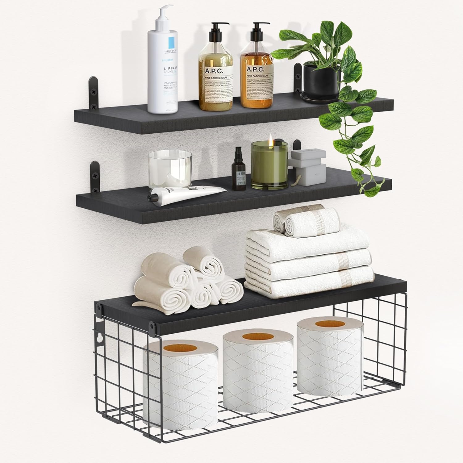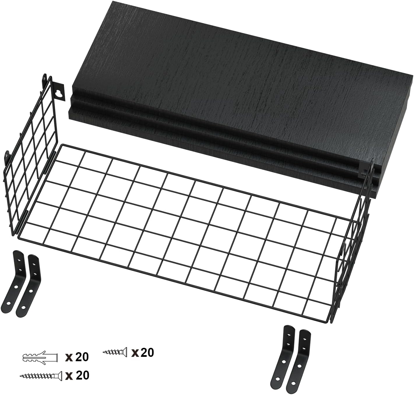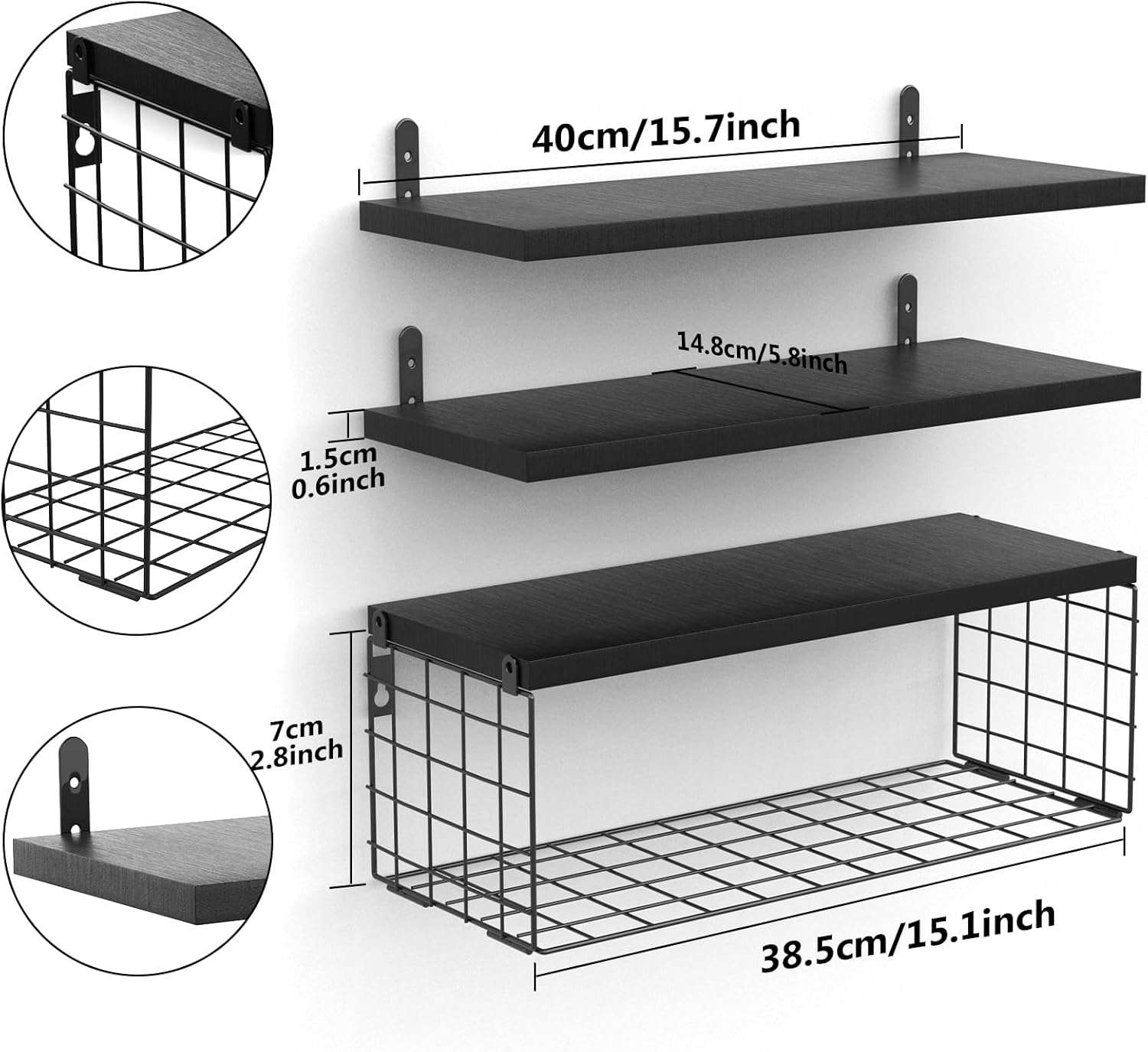 Ta komplet treh črnih plavajočih polic združuje minimalističen dizajn, funkcionalnost in trpežne materiale. Police so izdelane iz kakovostnega borovega lesa, pod njimi pa je pritrjen kovinski žični koš s prašno prevleko, ki je odporen proti rji in praskam.