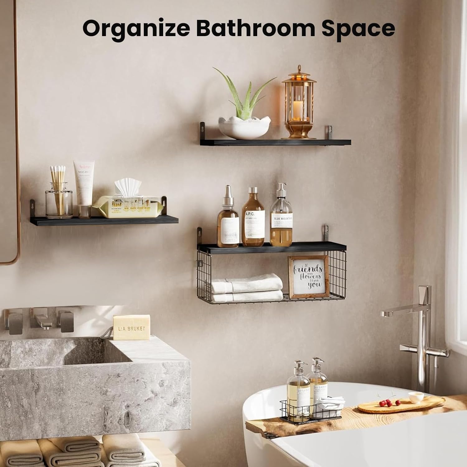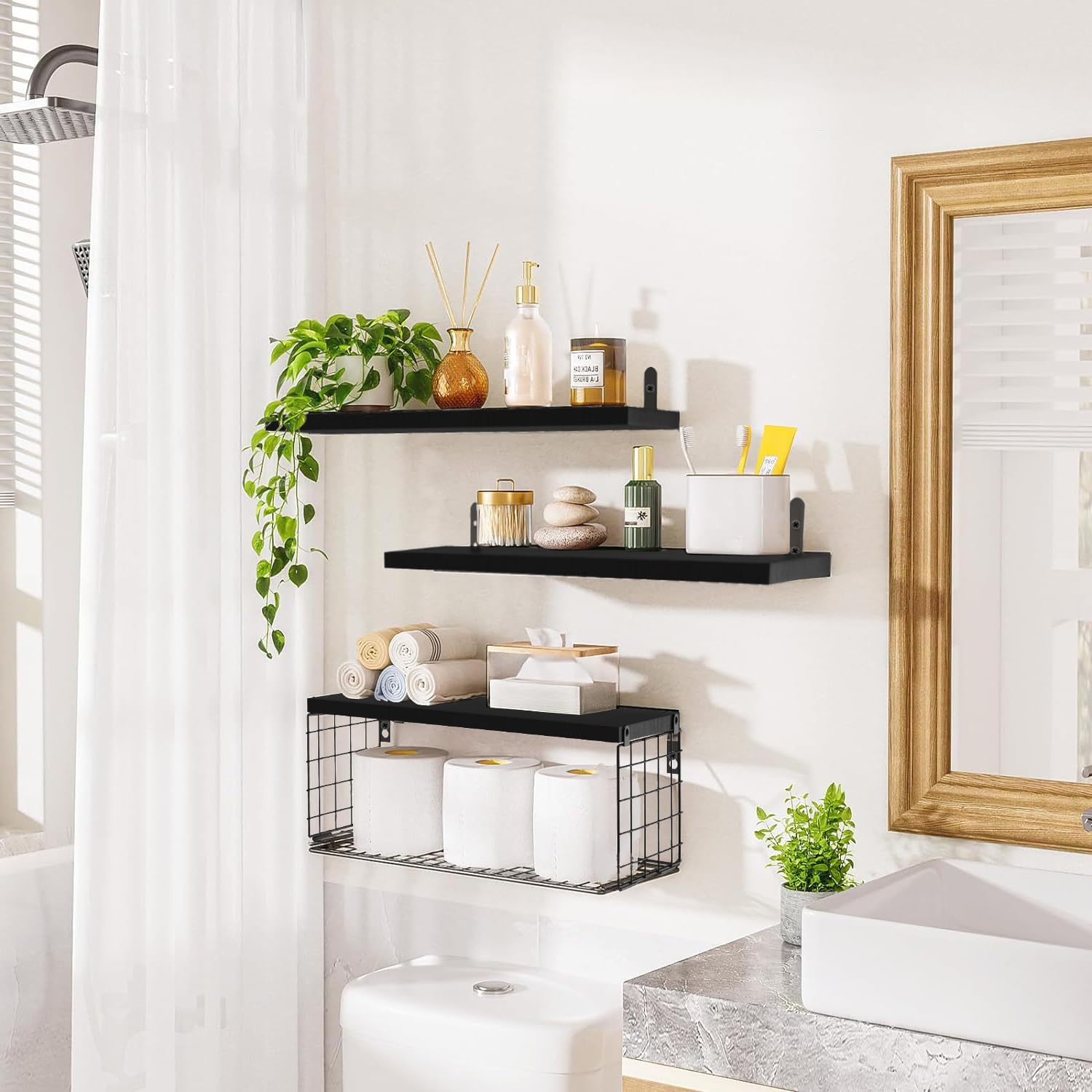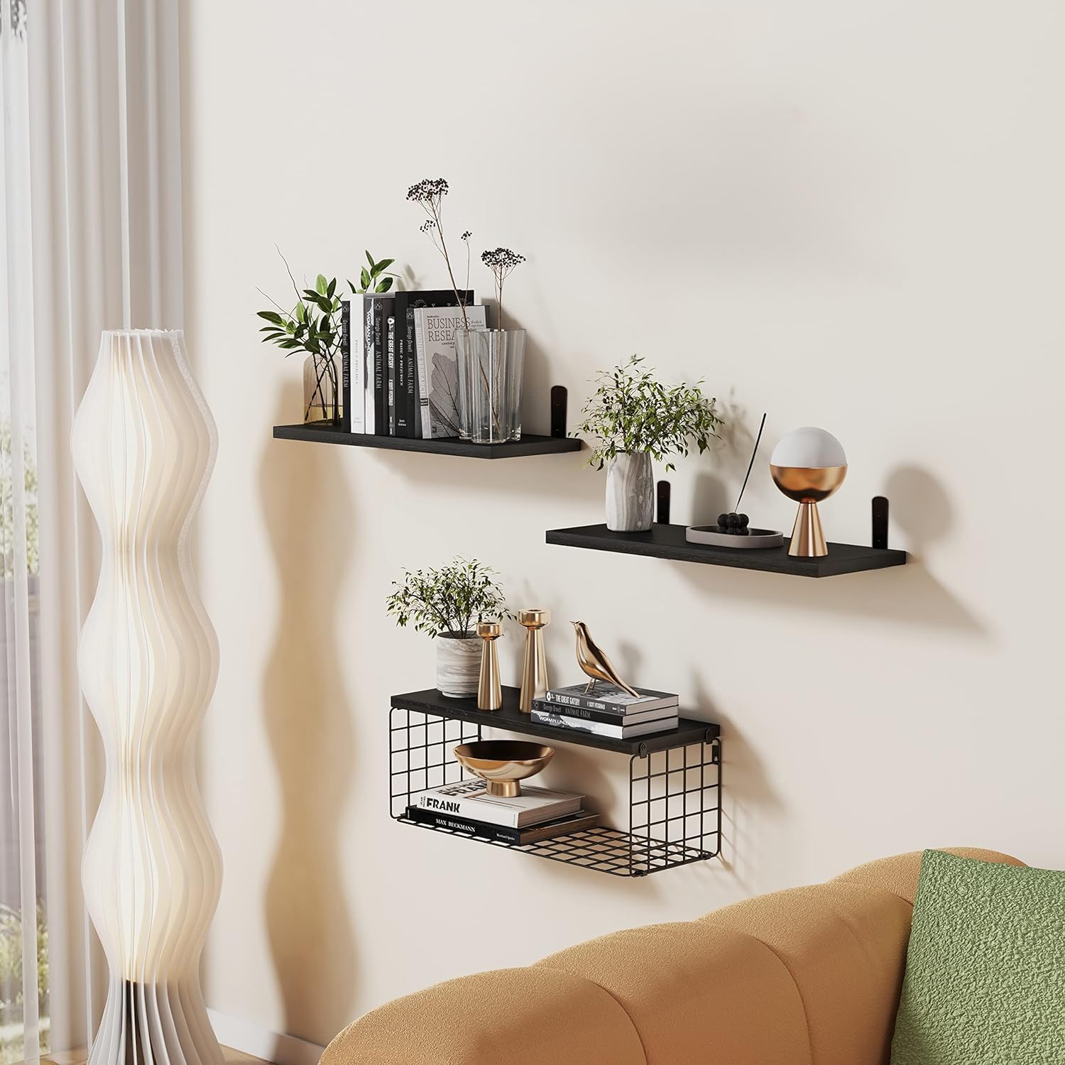 Ta komplet treh črnih plavajočih polic združuje minimalističen dizajn, funkcionalnost in trpežne materiale. Police so izdelane iz kakovostnega borovega lesa, pod njimi pa je pritrjen kovinski žični koš s prašno prevleko, ki je odporen proti rji in praskam.