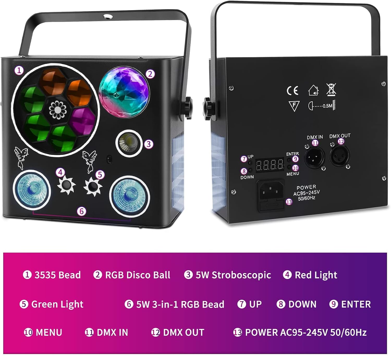 Napredna 5-v-1 LED svetilka združuje več svetlobnih efektov v eni kompaktni napravi: magično kalejdoskopsko kroglo, barvni vzorec, UV in stroboskopski učinek ter barvno osvetlitev. Zasnovana je za profesionalno ali domačo uporabo – idealna za poroke, klube, cerkvene dogodke, rojstne dneve in druge zabave, kjer je pomembna dinamična in barvita svetloba.