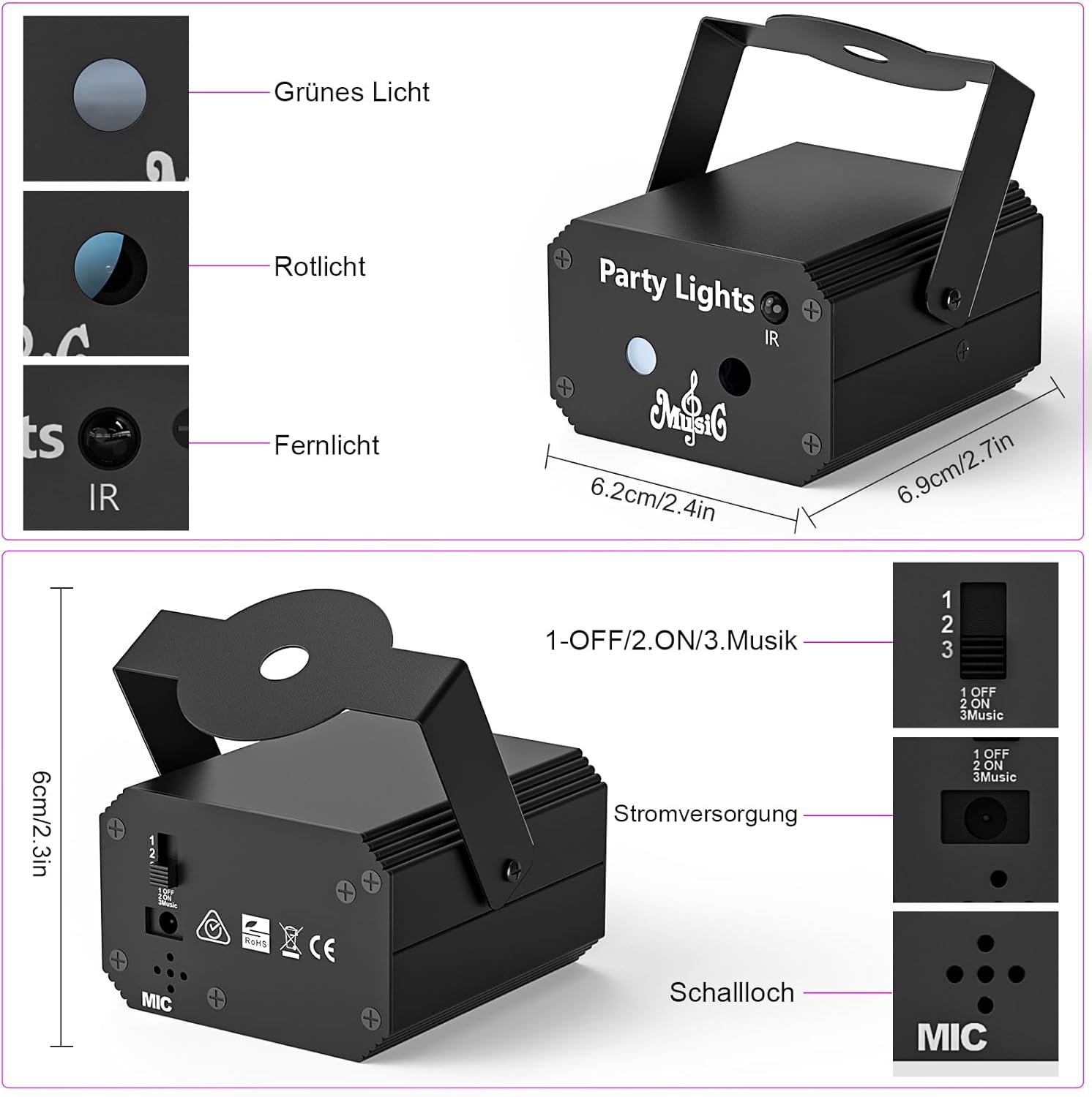 Zvočna aktivacija: vgrajen mikrofon omogoča, da se svetlobni efekti samodejno prilagajajo ritmu glasbe.