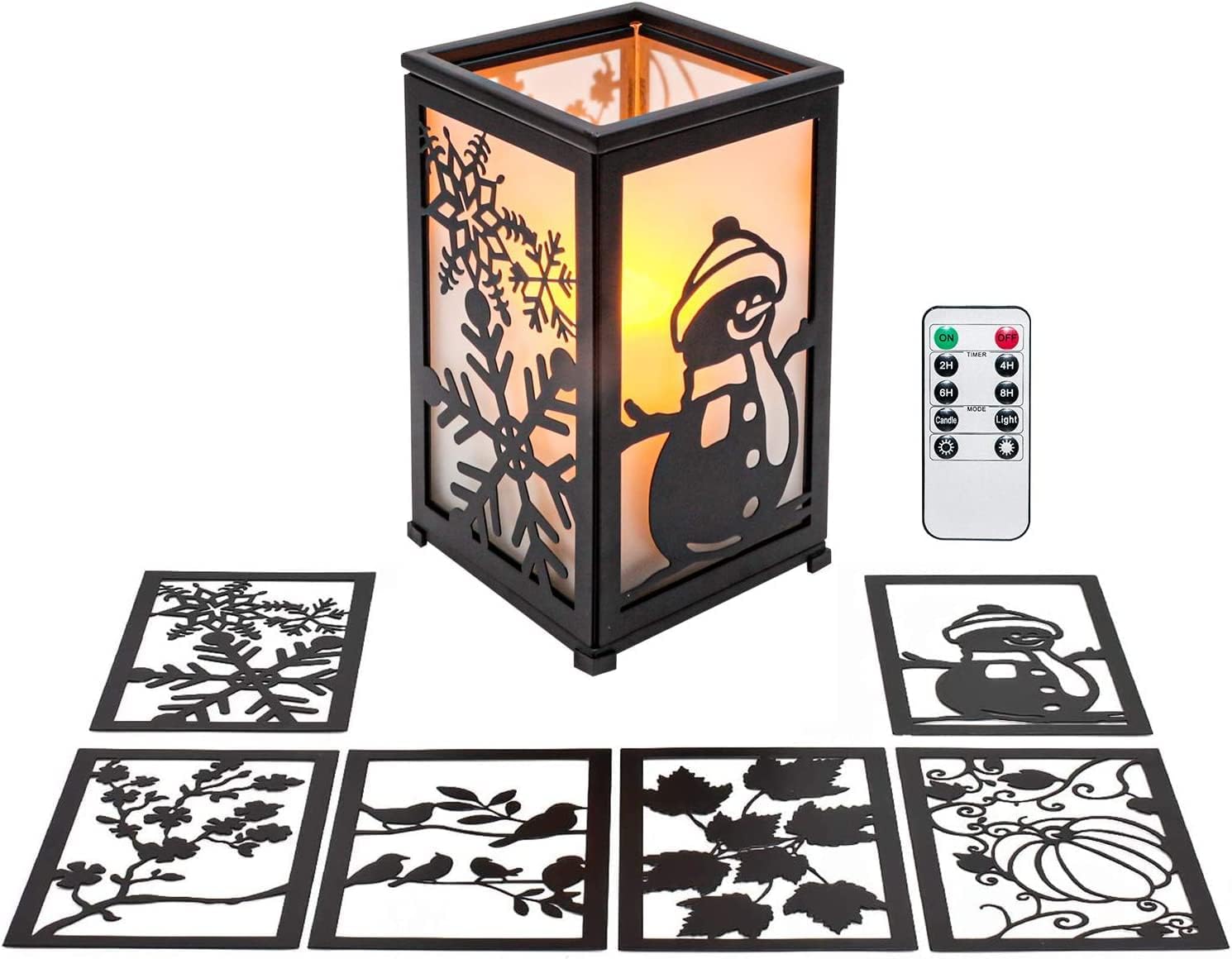 Elegantna kovinska laterna z LED svečo in izmenljivimi sezonskimi ploščicami za celoletno dekoracijo doma ali vrta.