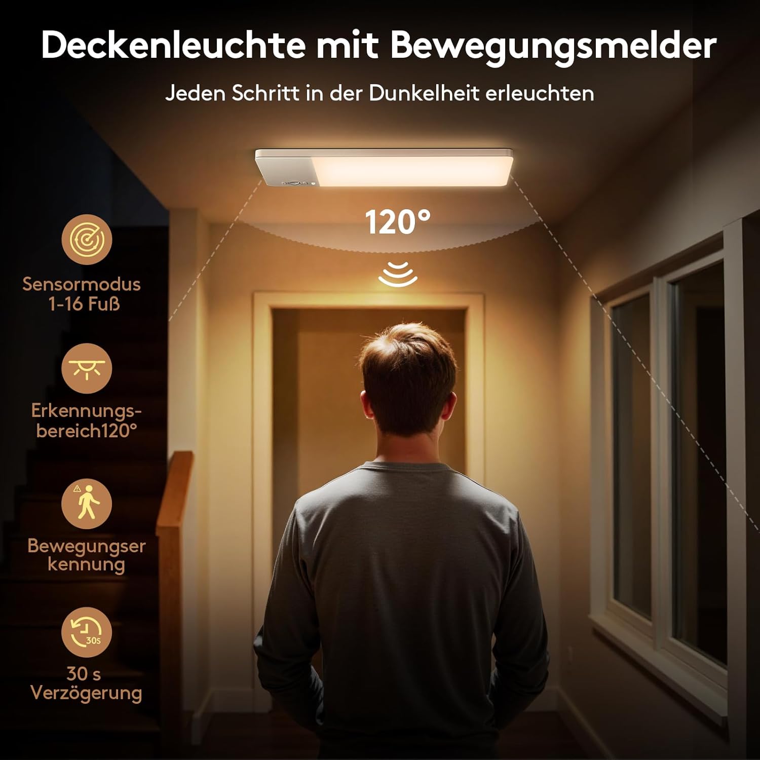 Pametni senzor gibanja: zazna gibanje v radiju do 5 metrov; samodejno vklopi svetlobo in jo izklopi po 30 sekundah neaktivnosti.