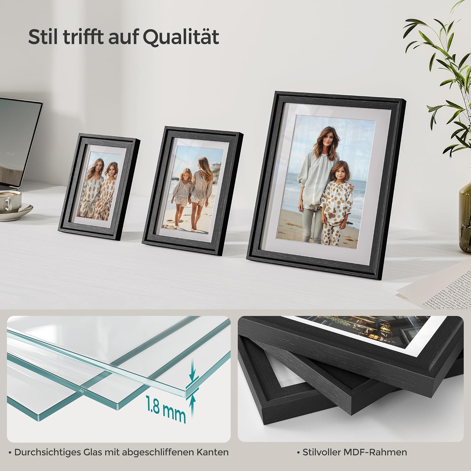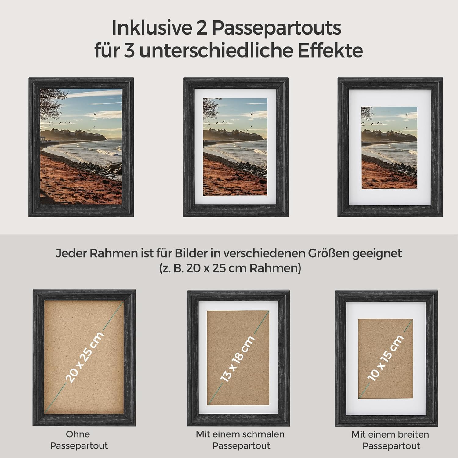 Univerzalno prileganje: vsak okvir ima 1–2 paspartuja, kar omogoča uporabo za različne velikosti slik (npr. 10×15 cm tudi za 9×13 cm slike).