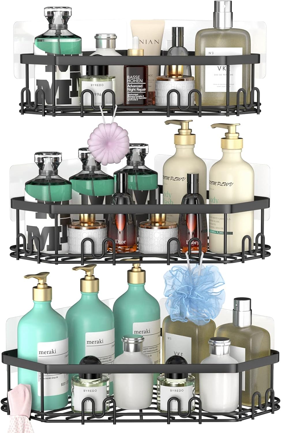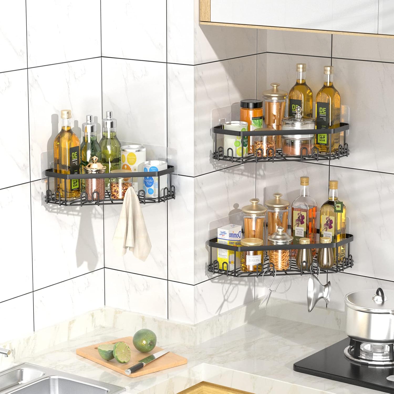 Praktičen komplet treh kotnih polic iz nerjavečega jekla omogoča učinkovito in elegantno shranjevanje kopalniških potrebščin. Priloženih 12 kljukic nudi dodaten prostor za obešanje gobic, britvic ali drugih dodatkov. Samolepilni nosilci omogočajo enostavno namestitev brez vrtanja in poškodb sten.